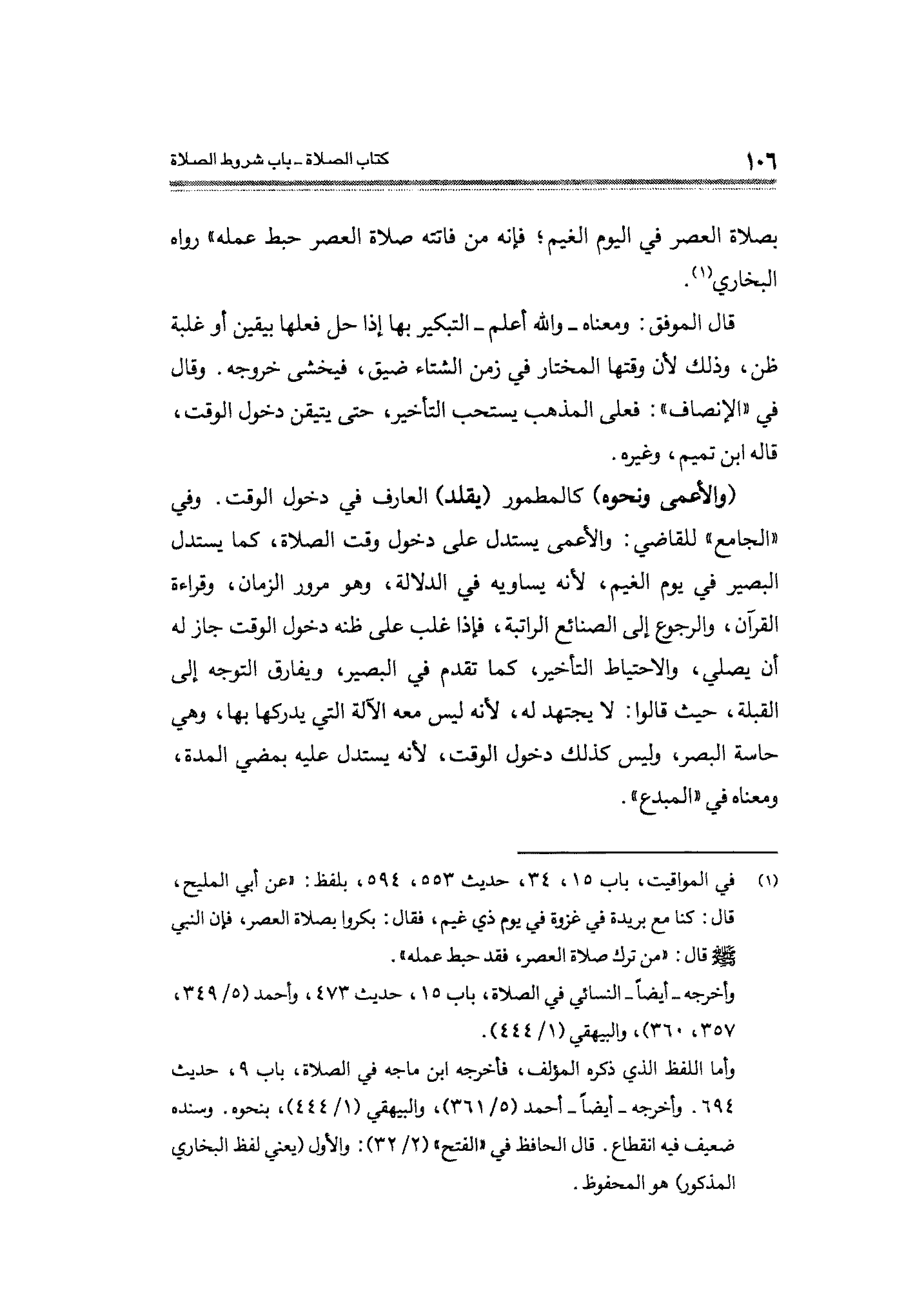 (¬١) في المواقيت، باب ١٥، ٥٣٤ حديث ٥٥٣، ٥٩٤، بلفظ: "عن أبي المليح، قال: كنا مع بريدة فى غزوة فى يوم ذي غيم، فقال: بكروا بصلاة العصر، فإن النبي - صلى الله عليه وسلم - قال: "من ترك صلاة العصر فقد حبط عمله".