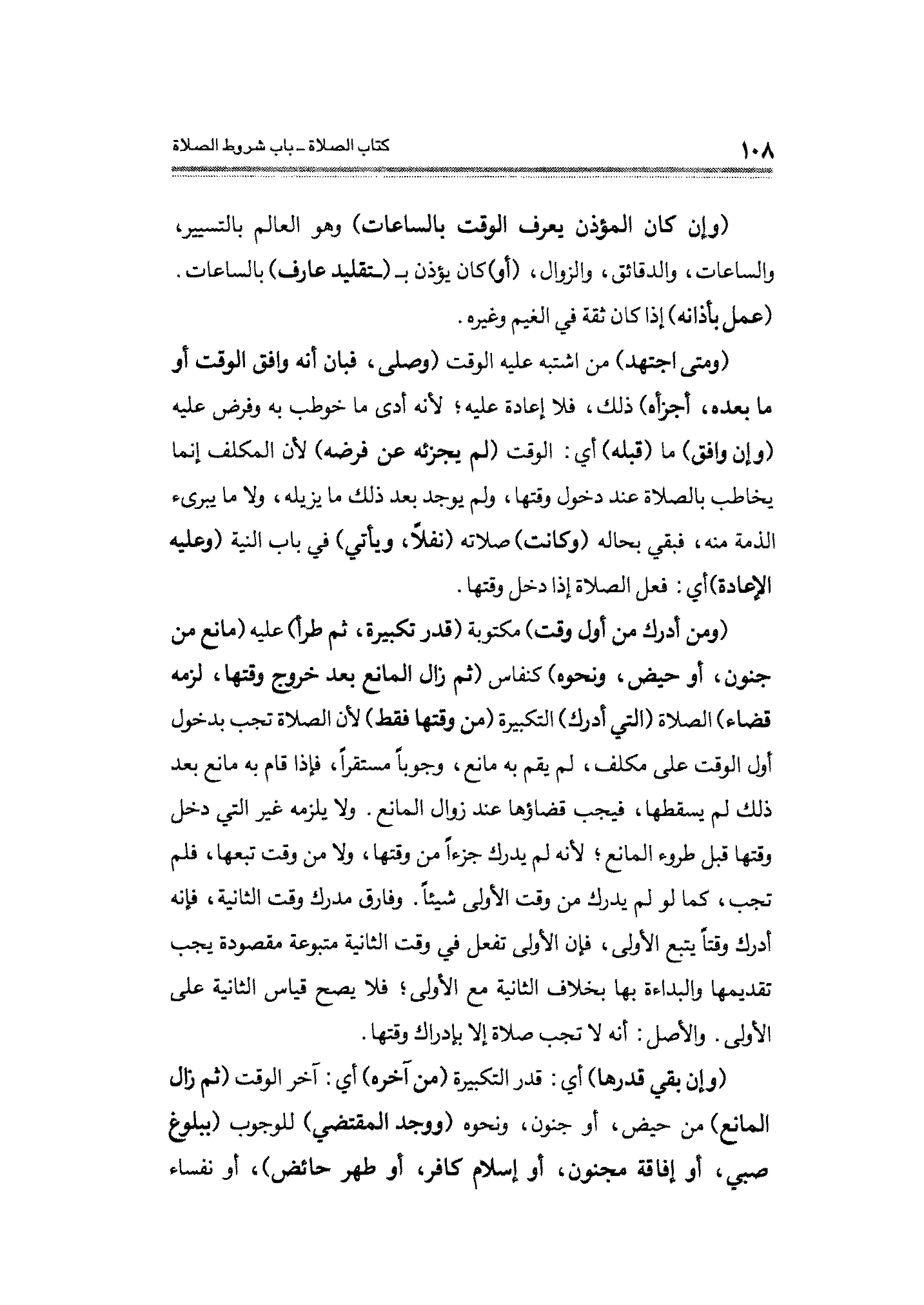 (ومن أدرك من أول وقت) مكتوبة (قدر تكبيرة، ثم طرأ) عليه (مانع من جنون، أو حيض، ونحوه) كنفاس (ثم زال المانع بعد خروج وقتها، لزمه قضاء) الصلاة (التي أدرك) التكبيرة (من وقتها فقط) لأن الصلاة تجب بدخول أول الوقت على مكلف، لم يقم به مانع، وجوبًا مستقرًا، فإذا قام به مانع بعد ذلك لم يسقطها، فيجب قضاؤها عند زوال المانع. ولا يلزمه غير التي دخل وقتها قبل طروء المانع؛ لأنه لم يدرك جزءًا من وقتها، ولا عن وقت تبعها، فلم تجب، كما لو لم يدرك من وقت الأولى شيئًا. وفارق مدرك وقت الثانية، فإنه أدرك وقتًا يتبع الأولى، فإن الأولى تفعل في وقت الثانية متبوعة مقصودة يجب تقديمها والبداءة فيها بخلاف الثانية مع الأولى؛ فلا يصح قياس الثانية على الأولى. والأصل: أنه لا تجب صلاة إلا بإدراك وقتها.