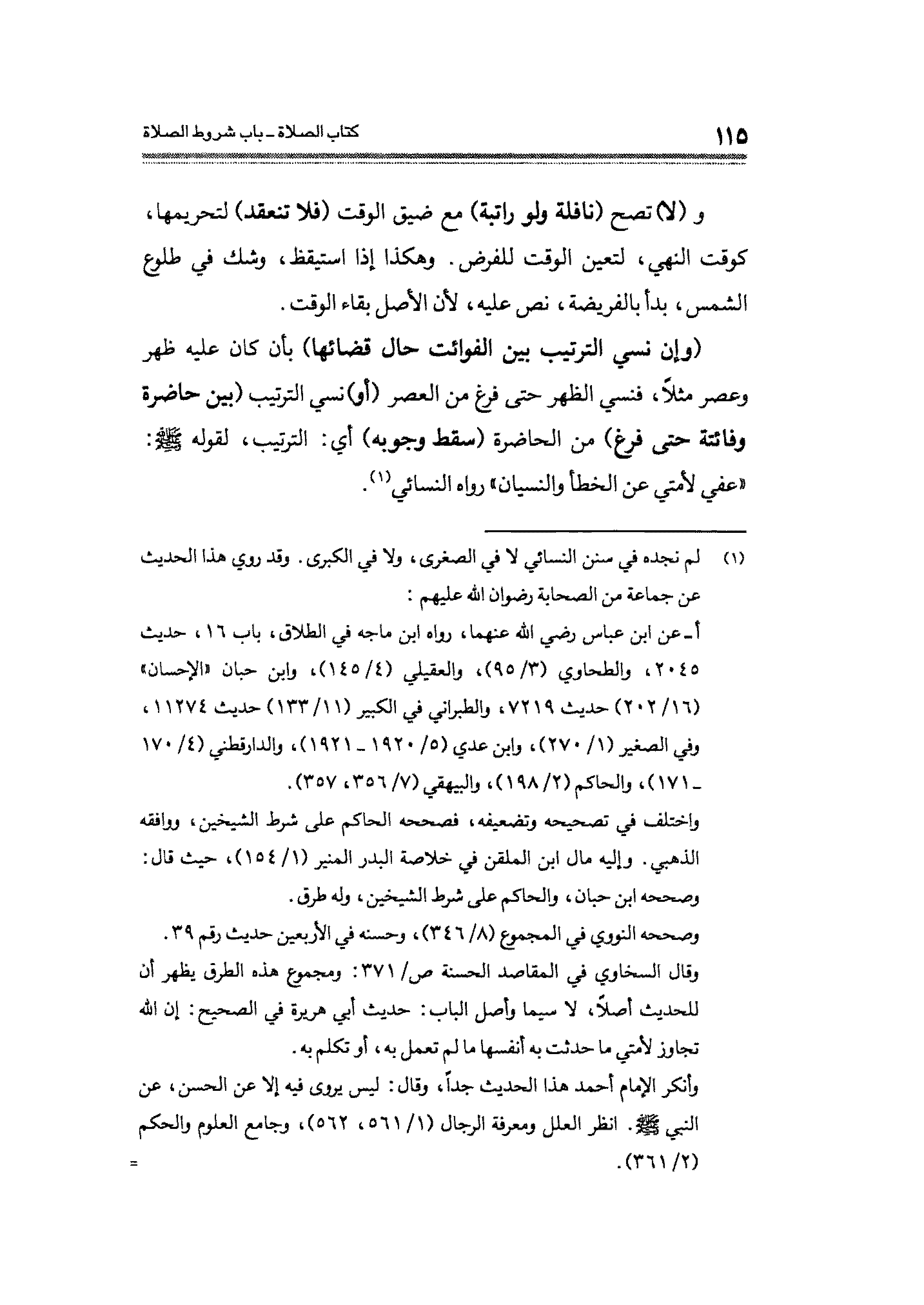 (وإن نسي الترتيب بين الفوائت حال قضائها) بأن كان عليه ظهر وعصر مثلًا، فنسي الظهر حتَّى فرغ من العصر (أو) في الترتيب (بين حاضرة وفائتة حتَّى فرغ) من الحاضرة (سقط وجوبه) أي: الترتيب، لقوله - صلى الله عليه وسلم -: "عفي لأمتي عن الخطأ والنسيان" رواه النسائي (¬١).
