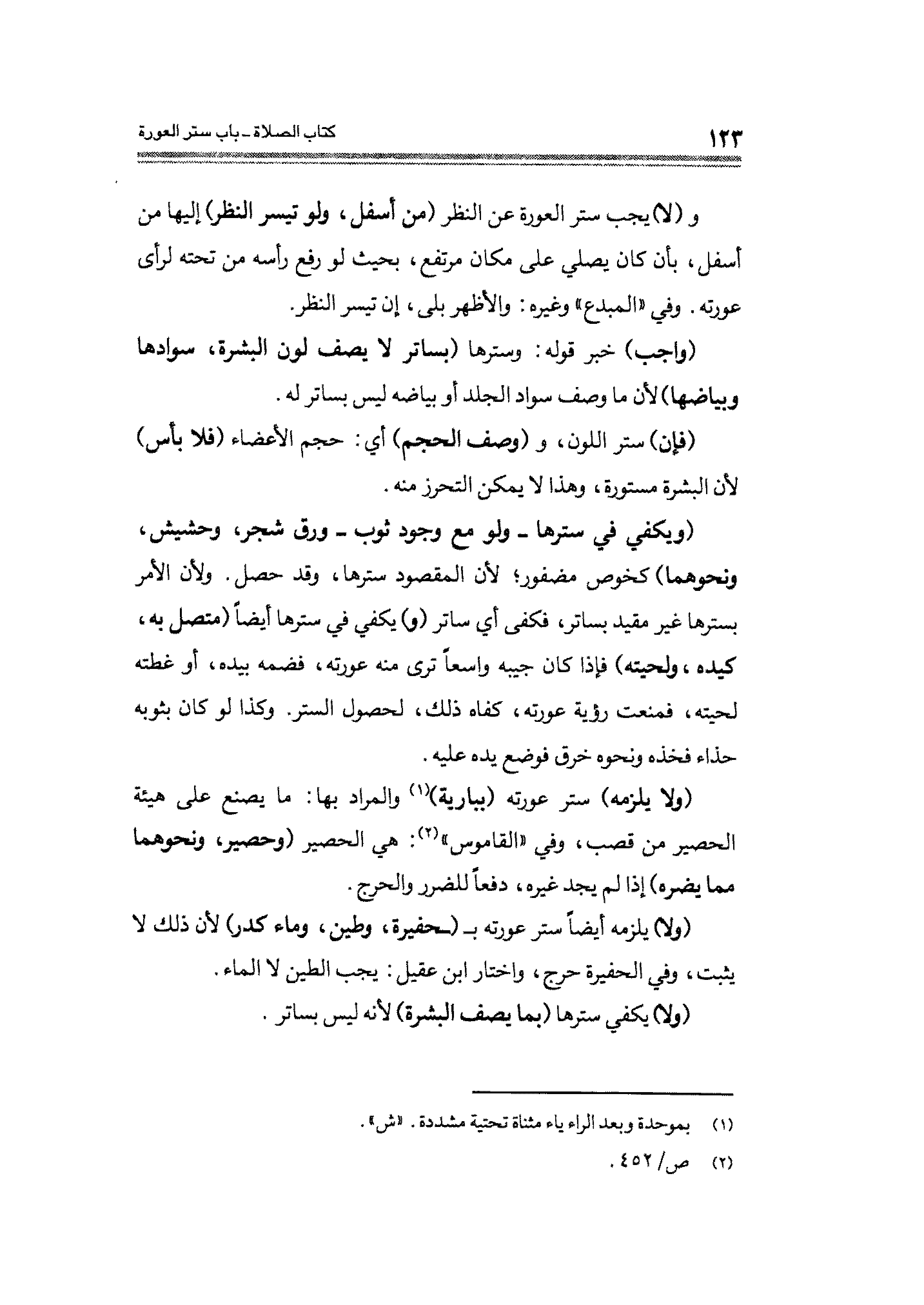 (ولا يلزمه) ستر عورته (ببارية) (¬١) والمراد بها: ما يصنع على هيئة الحصير عن قصب، وفي "القاموس" (¬٢): هي الحصير (وحصير، ونحوهما مما يضره) إذا لم يجد غيره، دفعاً للضرر والحرج.