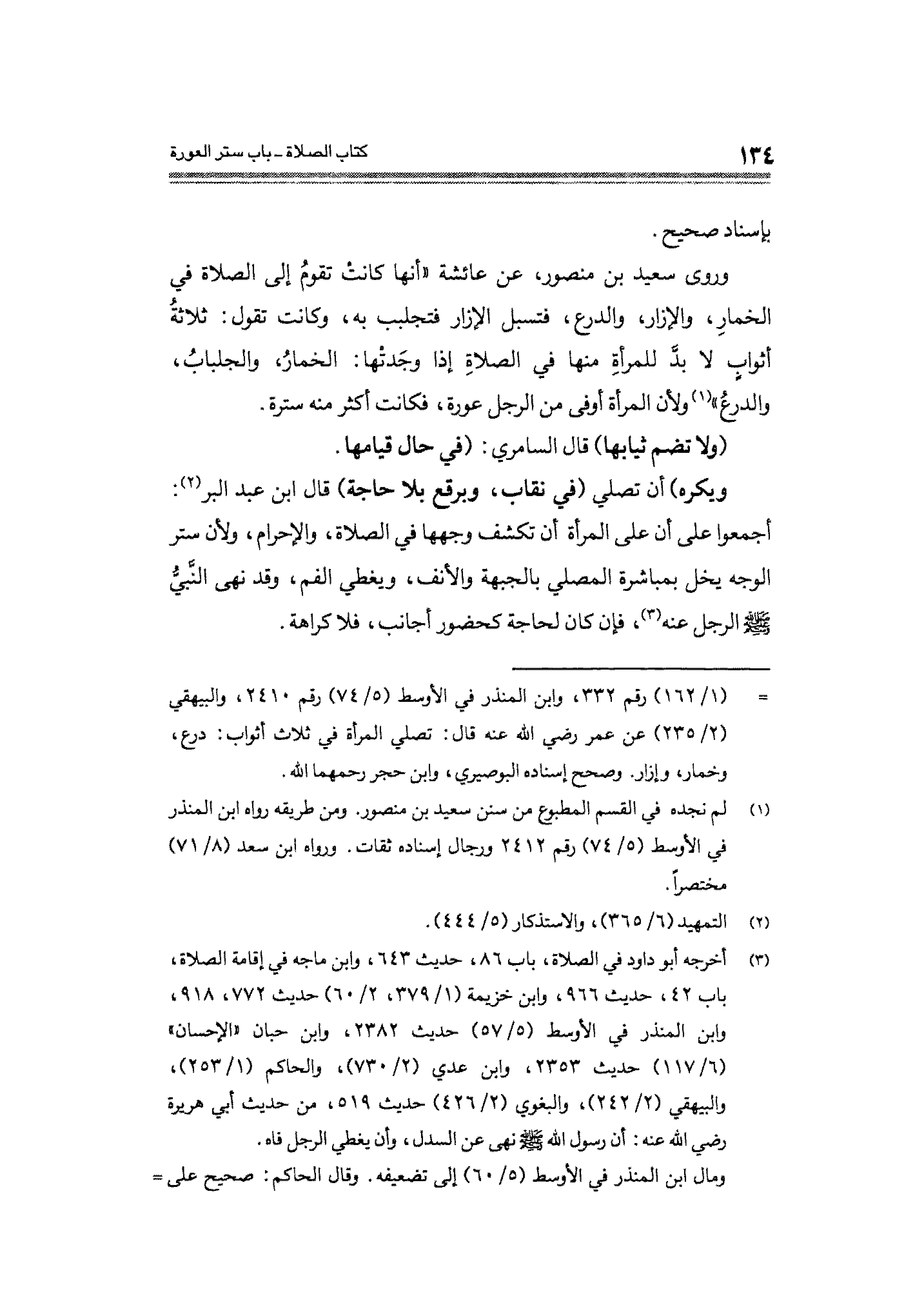 = (١/ ١٦٢) رقم ٣٣٢، وابن المنذر في الأوسط (٥/ ٧٤) رقم ٢٤١٠، والبيهقي (٢/ ٢٣٥) عن عمر - رضي الله عنه - قال: تصلي المرأة في ثلاث أثواب: درع، وخمار، وإزار. وصحح إسناده البوصيرى، وابن حجر رحمهما الله.