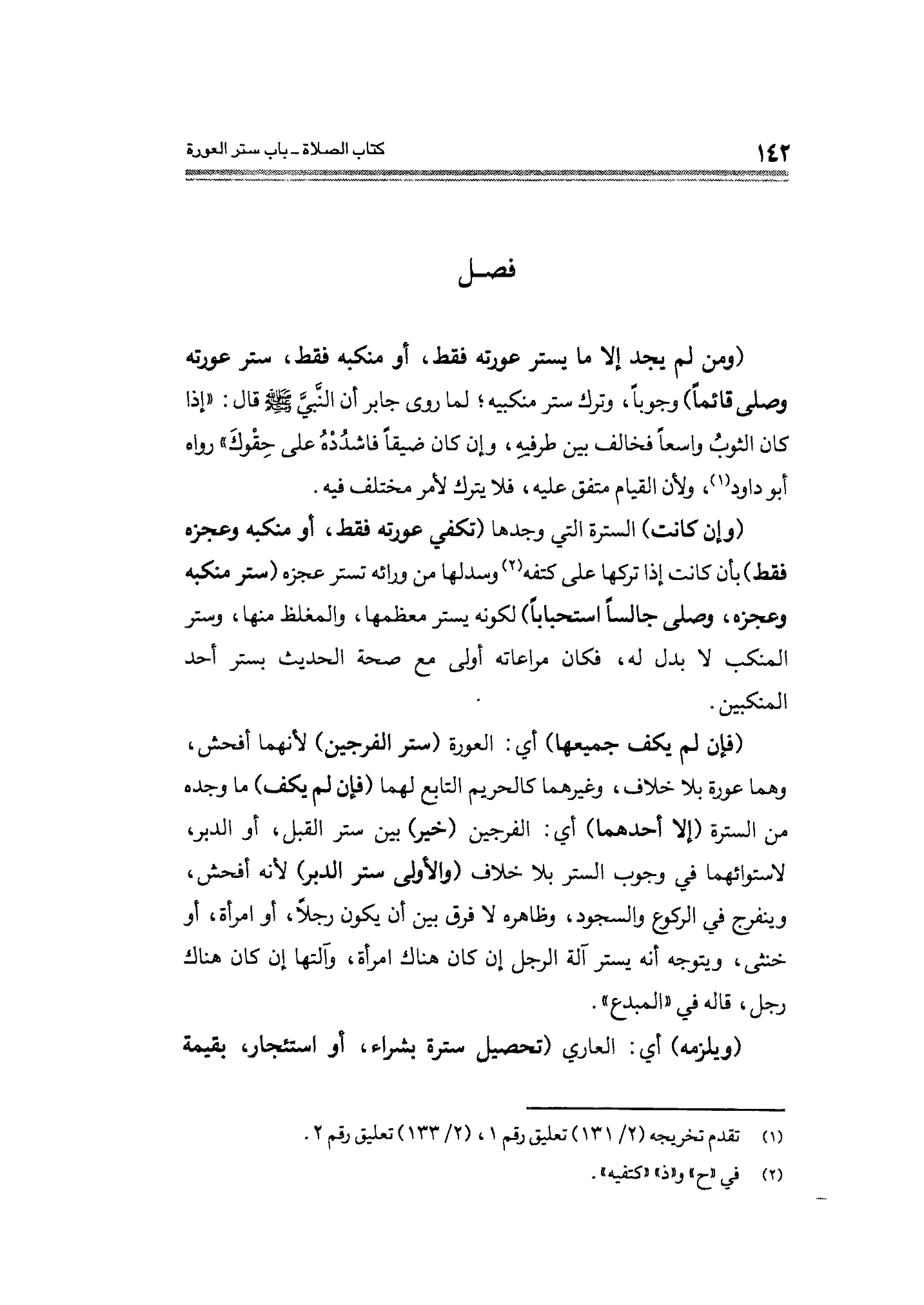 (فإن لم يكف جميعها) أى: العورة (ستر الفرجين) لأنهما أفحش، وهما عورة بلا خلاف، وغيرهما كالحريم التابع لهما (فإن لم يكف) ما وجده من السترة (لا أحدهما) أي: الفرجين (خير) بين ستر القبل، أو الدبر، لاستوائهما في وجوب الستر بلا خلاف. (والأولى ستر الدبر) لأنه أفحش، وينفرج في الركوع والسجود، وظاهره لا فرق بين أن يكون رجلاً، أو امرأة، أو خنثى، ويتوجه أنه يستر آلة الرجل إن كان هناك امرأة، وآلتها إن كان هناك رجل، قاله في "المبدع".