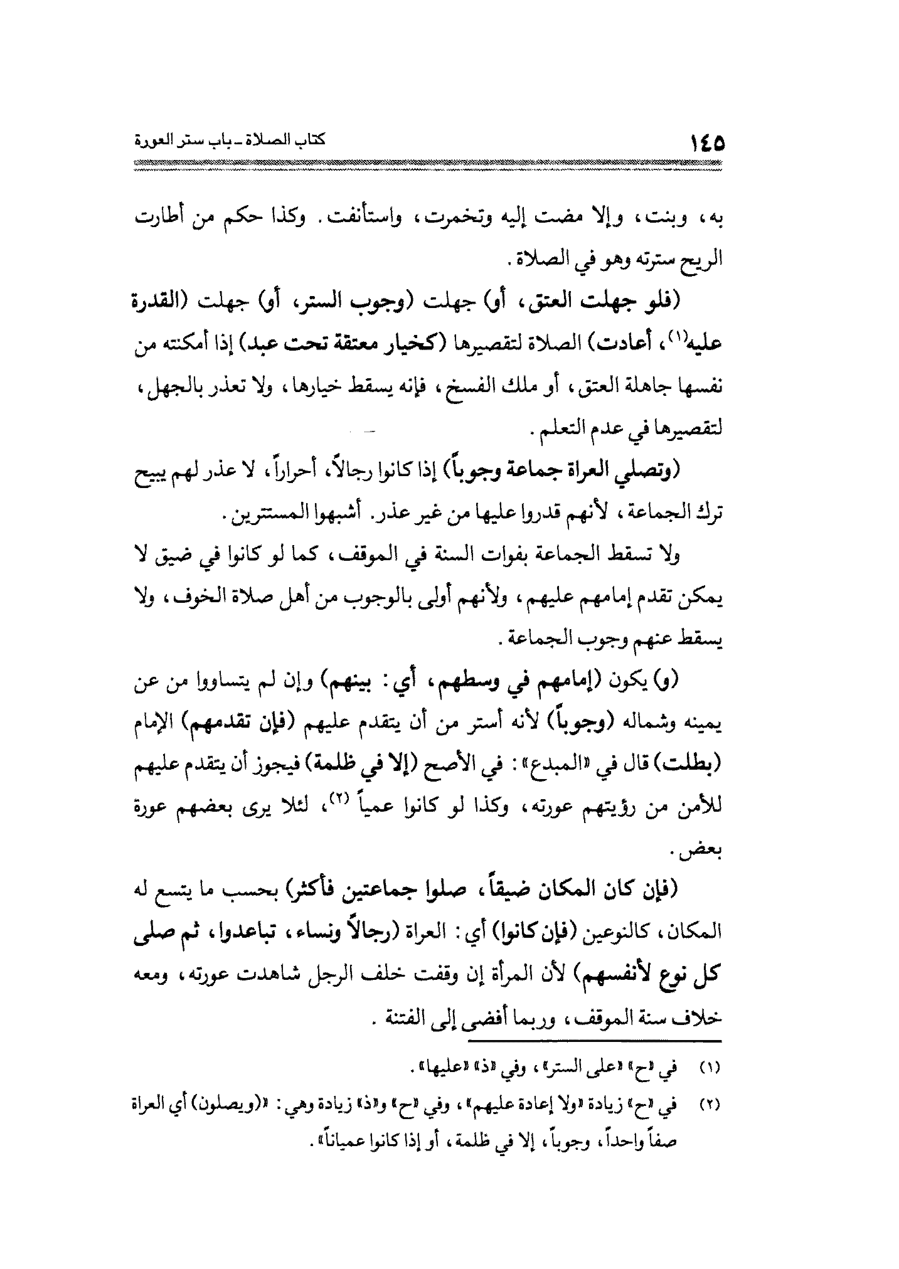 (¬٢) في "ح" "زيادة" "ولا إعادة عليهم"، وفي "ح" و "ذ" زيادة وهي: " (ويصلون) أي العراة صفاً واحداً، وجوباً، إلا في ظلمة، أو إذا كانوا عمياناً".