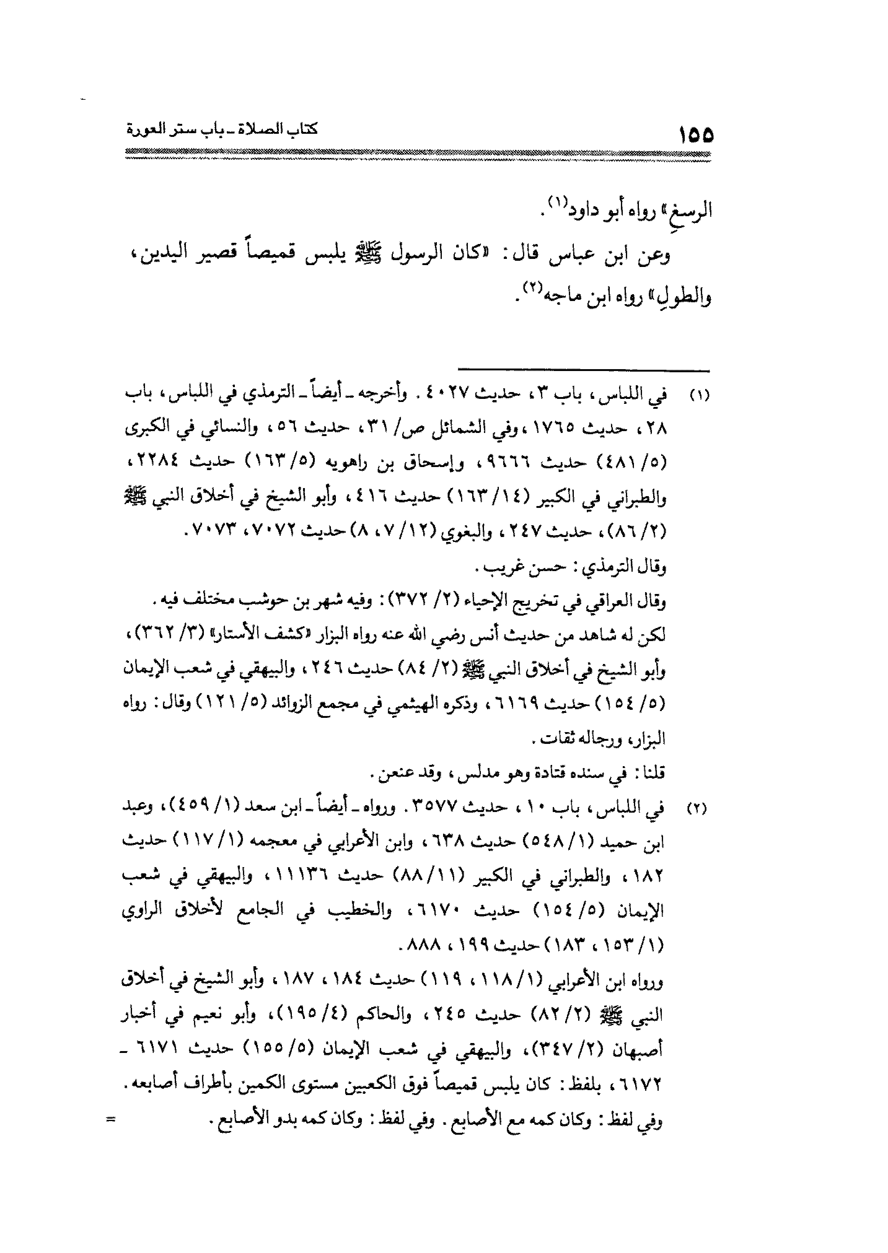 وعن ابن عباس قال: "كان الرسول - صلى الله عليه وسلم - يلبس قميصاً قصير اليدين، والطولِ" وواه ابن ماجه (¬٢).