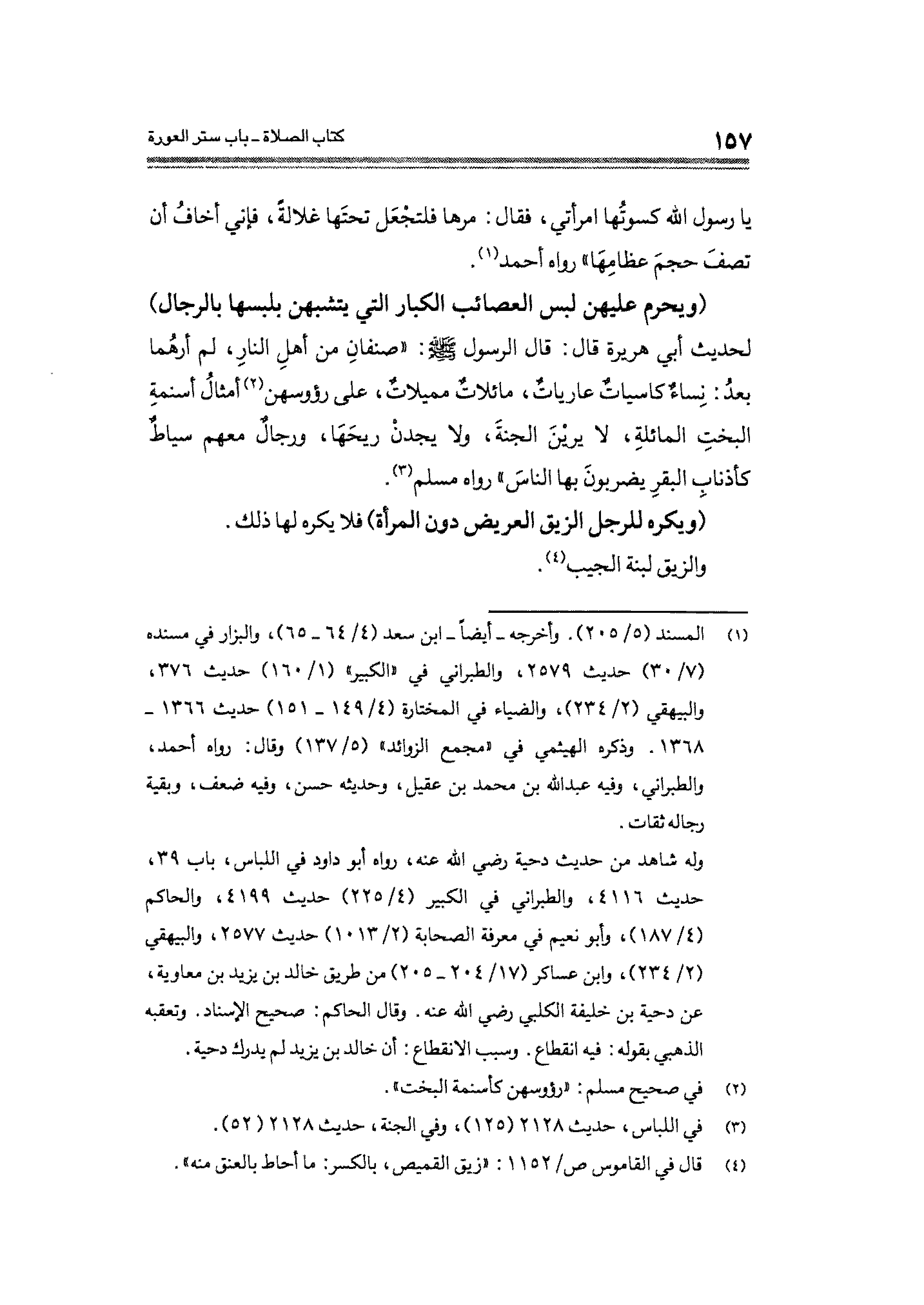 يا رسول الله كسوتُها امرأتي، فقال: مرها فلتجعَل تحتَها غلالةً، فإني أخافُ أن تصفَ حجمَ عظامِهَا" رواه أحمد (¬١).