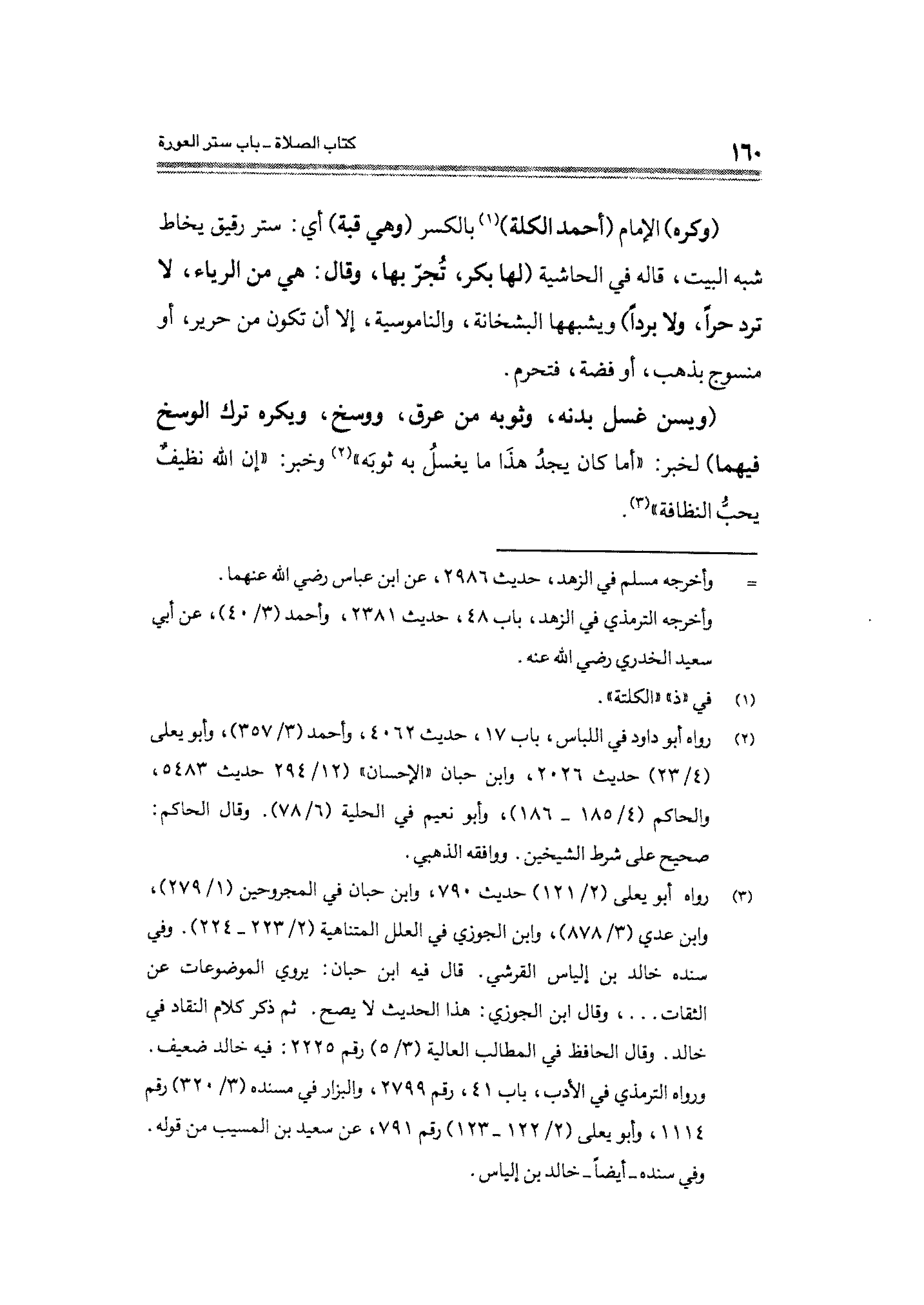 (ويسن غسل بدنه، وثوبه من عرق، ووسخ، ويكره ترك الوسخ فيهما) لخبر: "أما كان يجدُ هذَا ما يغسلُ به ثوبَه" (¬٢) وخبر: "إن الله نظيفٌ يحبُّ النظافة" (¬٣).