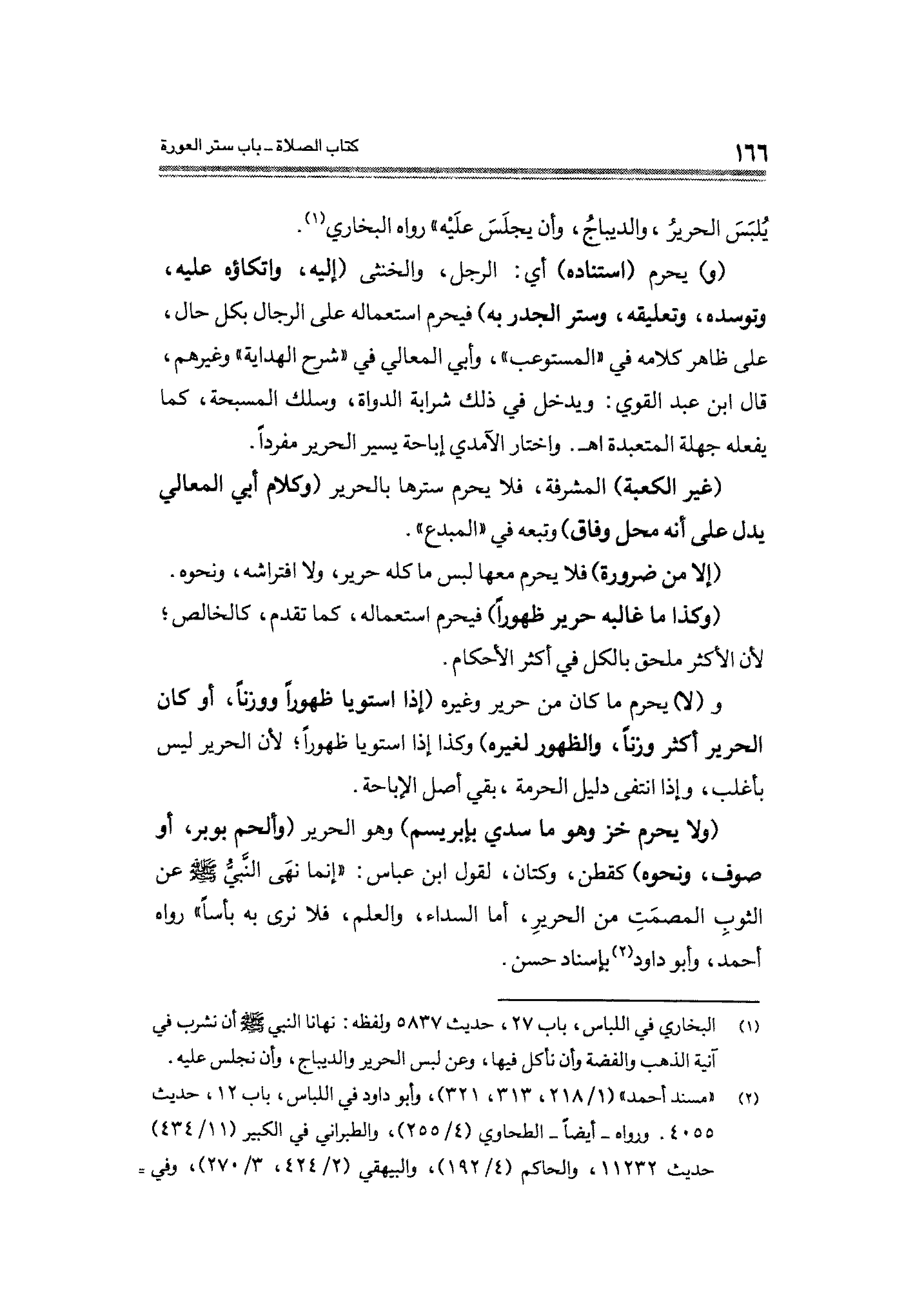 (و) يحرم (إسناده) أي: الرجل، والخنثى (إليه، واتكاؤه عليه، وتوسده، وتعليقه، وستر الجدر به) فيحرم استعماله على الرجال بكل حال، على ظاهر كلامه في "المستوعب"، وأبي المعالي في "شرح الهداية" وغيرهم، قال ابن عبد القوي: ويدخل في ذلك شرابة الدواة، وسلك المسبحة، كما يفعله جهلة المتعبدة اهـ. واختار الآمدي إباحة يسير الحرير مفردًا.