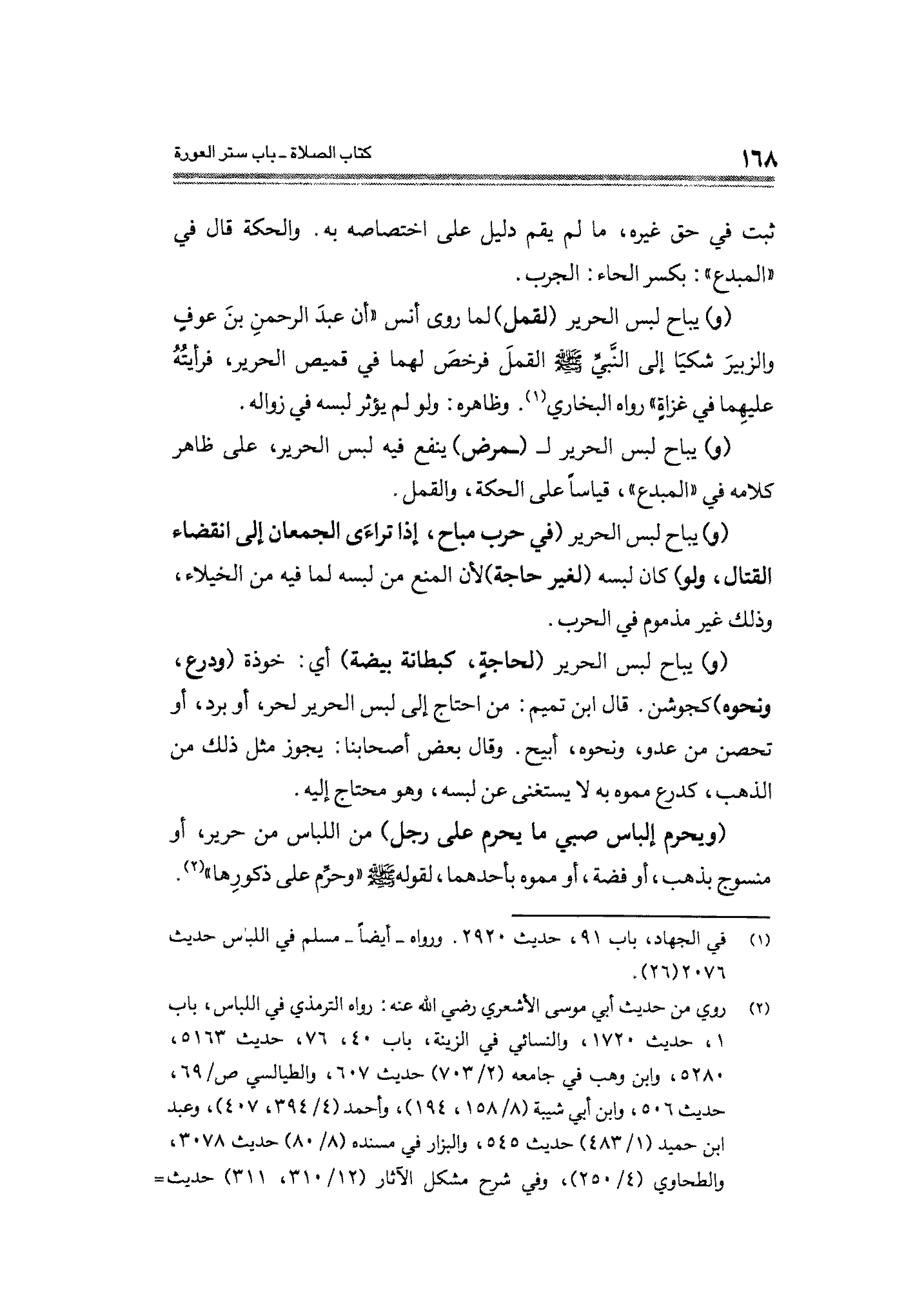 (و) يباح لبس الحرير (لحاجةٍ، كبطانة بيضة) أي: خوذة (ودرع، ونحوه) كجوشن. قال ابن تميم: من احتاج إلى لبس الحرير لحر، أو برد، أو تحصن من عدو، ونحوه، أبيح. وقال بعض أصحابنا: يجوز مثل ذلك من الذهب، كدرع مموه به لا يستغنى عن لبسه، وهو محتاج إليه.