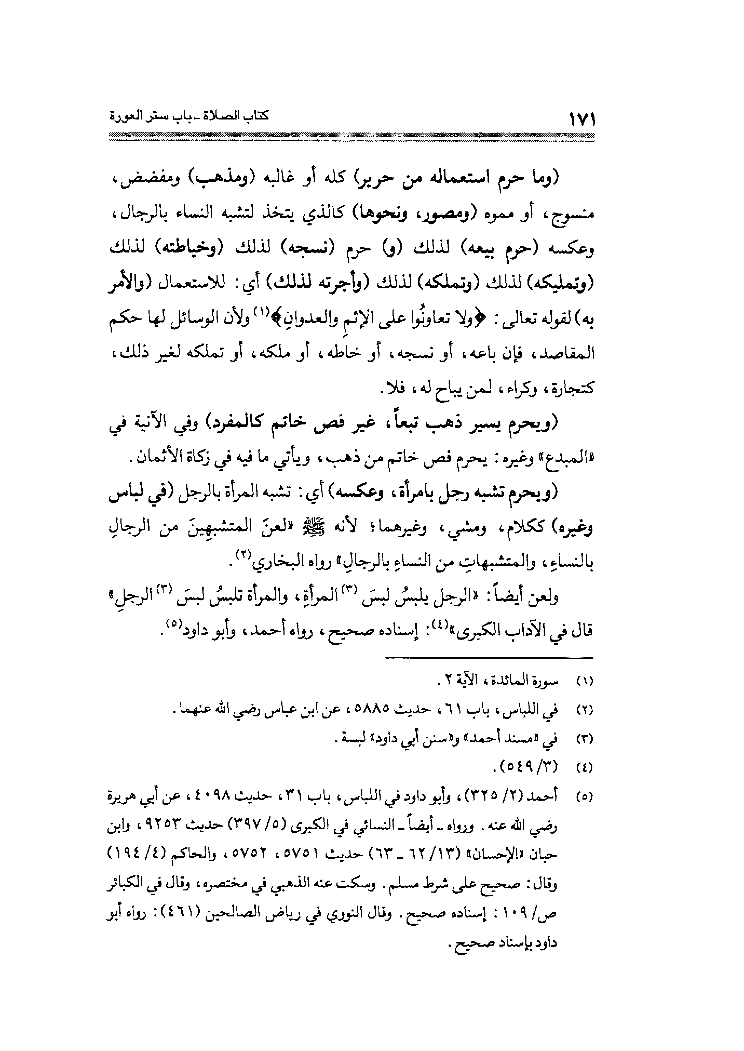 ولعن أيضًا: "الرجل يلبس لبسَ (¬٣) المرأةِ، والمرأة تلبس لبسَ (¬٣) الرجلِ" قال في الآداب الكبرى" (¬٤): إسناده صحيح، رواه أحمد، وأبو داود (¬٥).