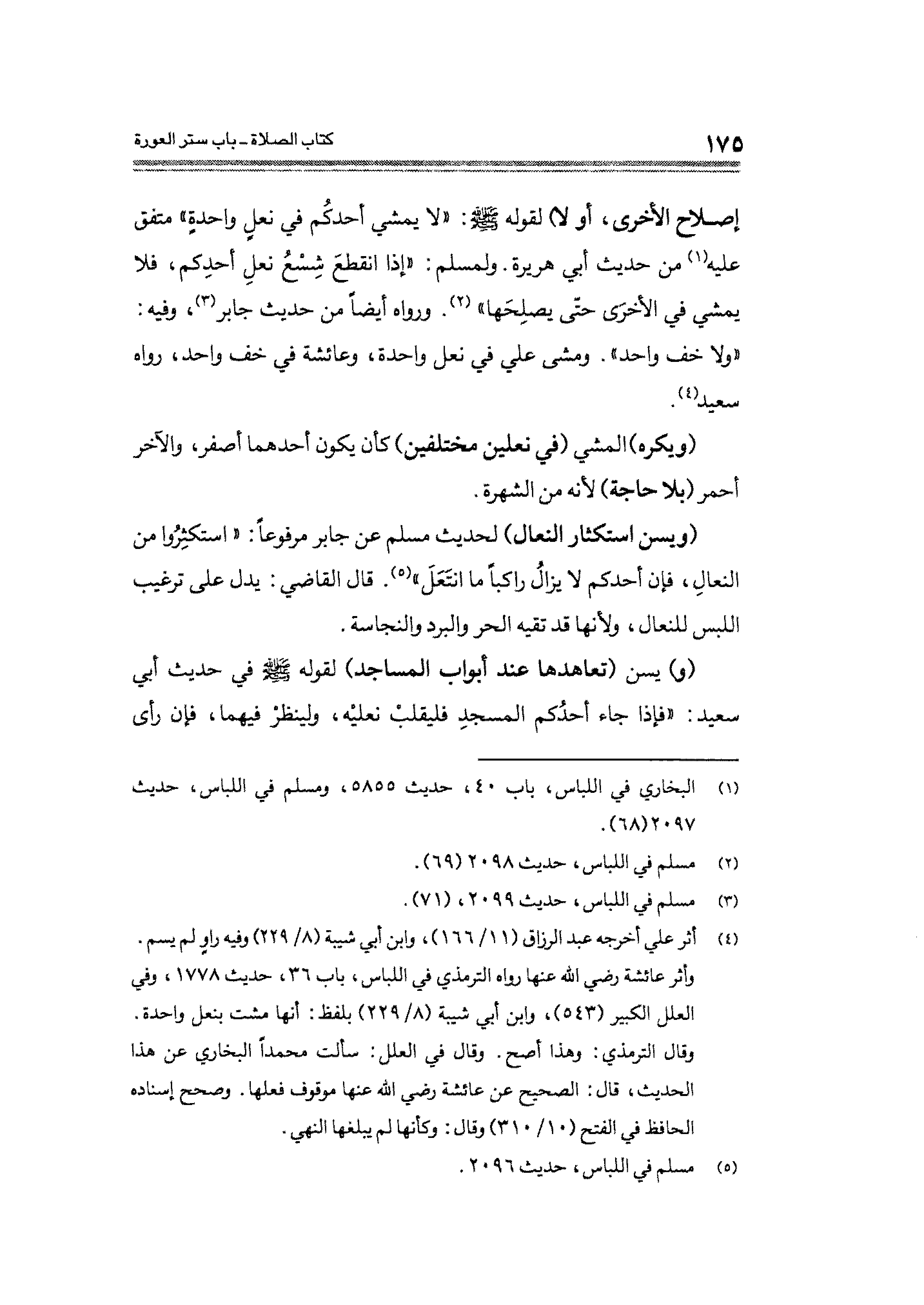 وأثر عائشة رضي الله عنها رواه الترمذي في اللباس، باب ٣٦، حديث ١٧٧٨، وفي العلل الكبير (٥٤٣)، وابن أبي شيبة (٨/ ٢٢٩) بلفظ: أنها مشت بنعل واحدة.