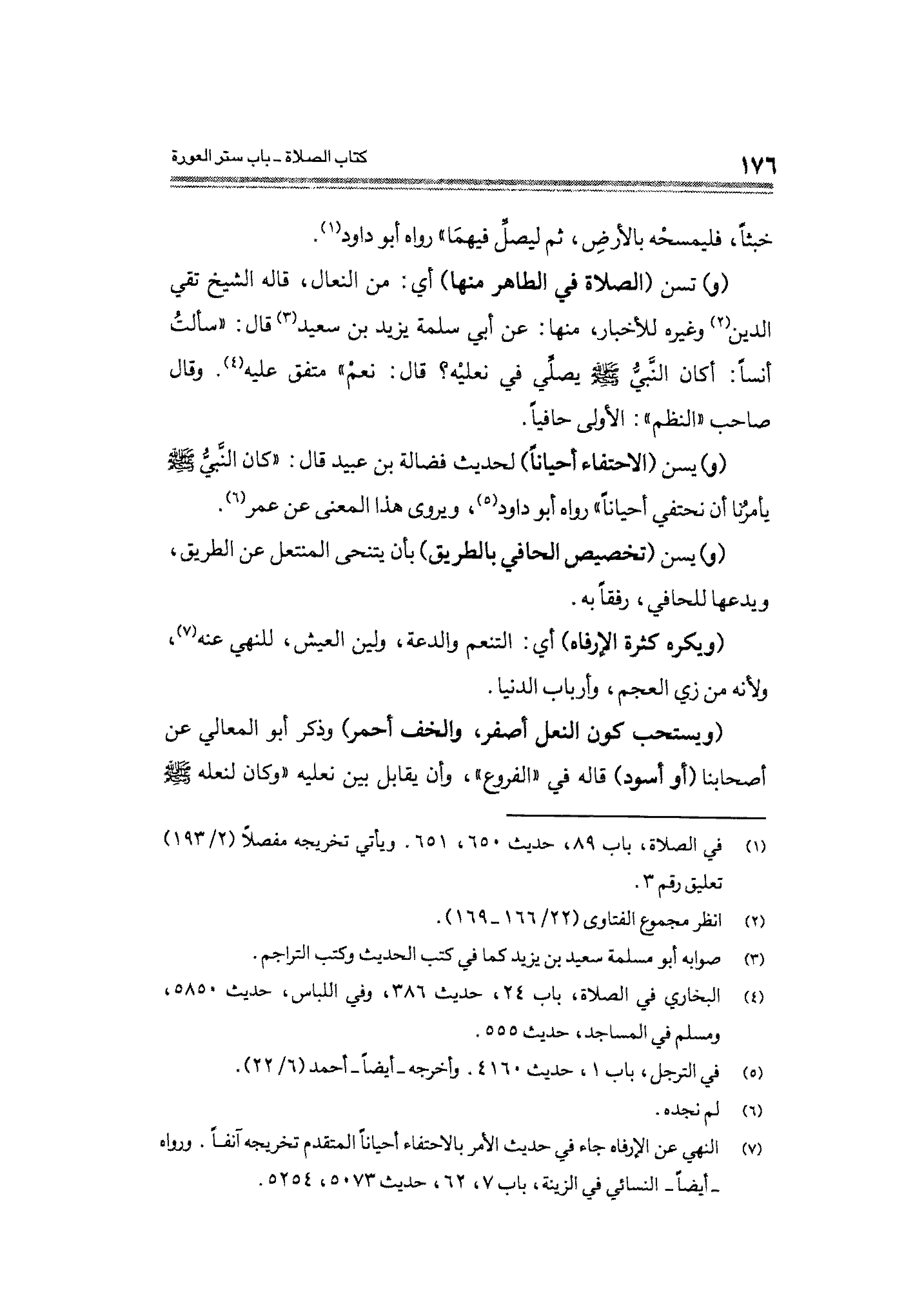 (و) تسن (الصَّلاة في الطَّاهر منها) أي: من النعال، قاله الشيخ تقي الدين (¬٢) وغيره للأخبار، منها: عن أبي سلمة يزيد بن سعيد (¬٣) قال: "سألتُ أنسًا: أكان النبي - صلى الله عليه وسلم - يصلِّي في نعليه؟ قال: نعمْ" متَّفقٌ عليه (¬٤). وقال صاحب "النظم": الأولى حافيًا.