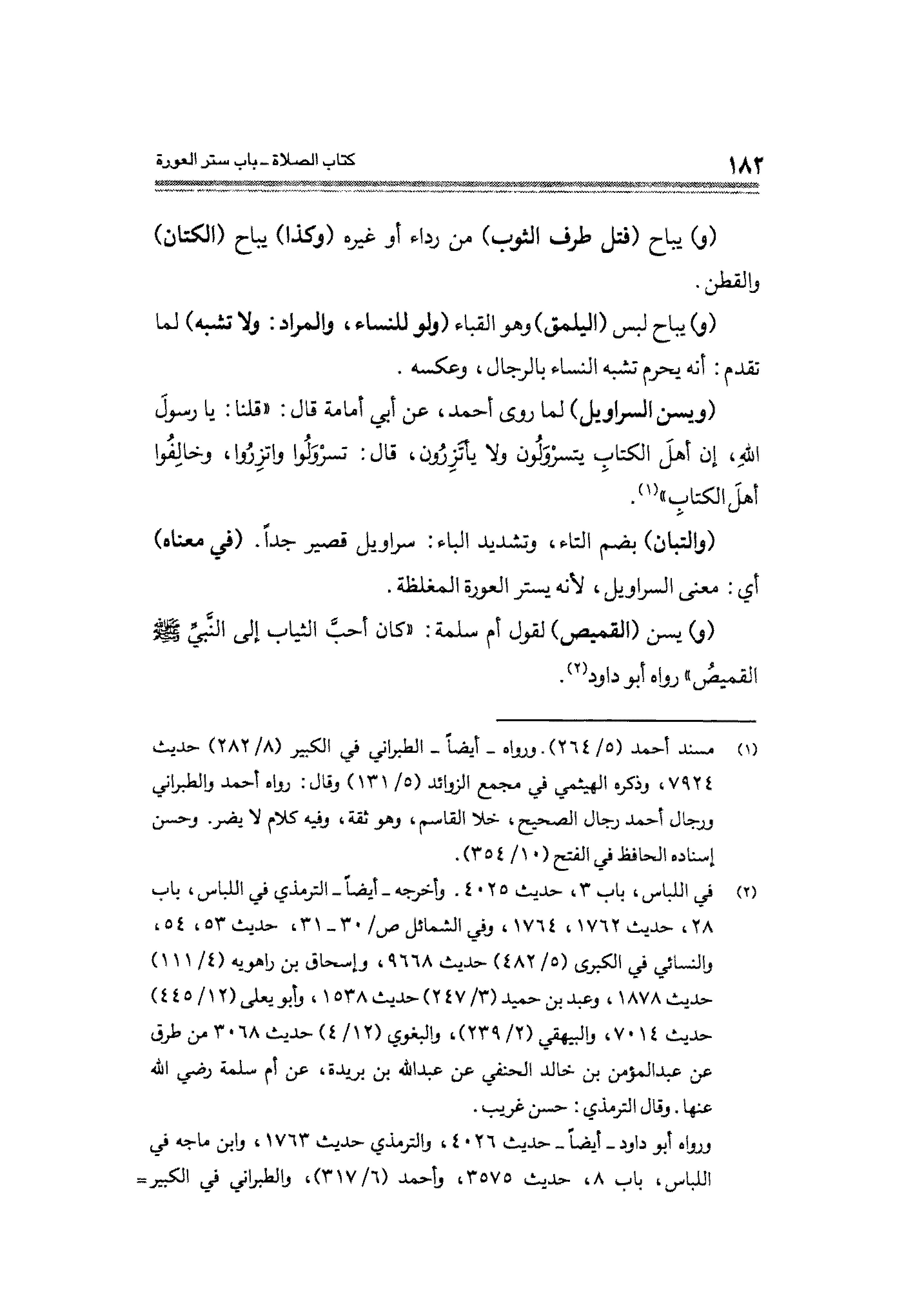 (ويسن السراويل) لما روى أحمد، عن أبي أمامة قال: "قلنا: يا رسولَ اللهِ، إن أهلَ الكتابِ يتسرْوَلُون ولا يأتَزِرُون، قال: تسرْوَلُوا واتزِرُوا، وخالِفُوا أهلَ الكتاب" (¬١).