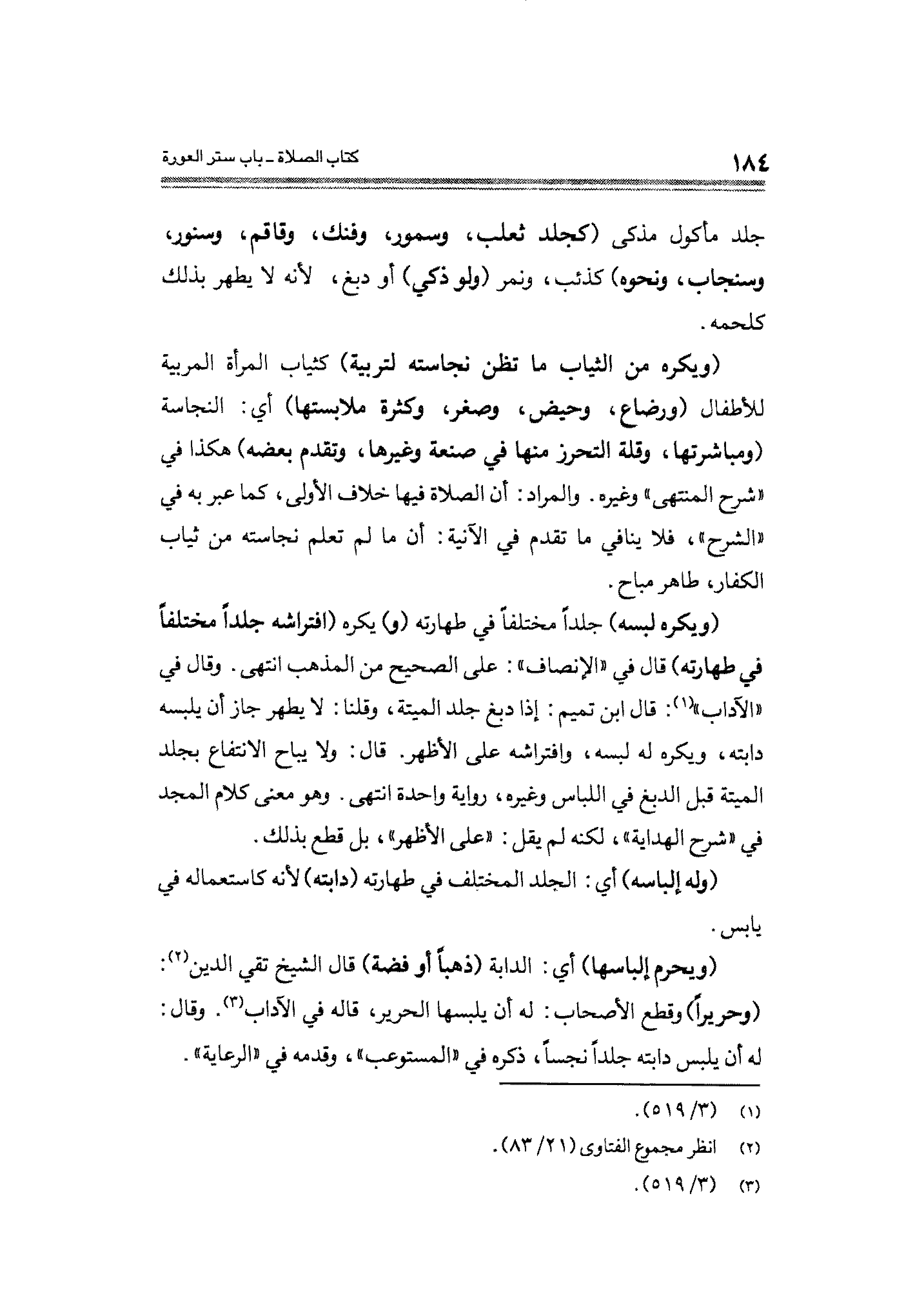 (ويكره لبسه) جلدًا مختلفًا في طهارته (و) يكره (افتراشه جلدًا مختلفًا في طهارته) قال في "الإنصاف": على الصحيح من المذهب انتهى. وقال في "الآداب" (¬١): قال ابن تميم: إذا دبغ جلد الميتة، وقلنا: لا يطهر جاز أن يلبسه دابته، ويكره له لبسه، وافتراشه على الأظهر. قال: ولا يباح الانتقاع بجلد الميتة قبل الدبغ في اللباس وغيره، رواية واحدة انتهى. وهو معنى كلام المجد في "شرح الهداية"، لكنه لم يقل: "على الأظهر"، بل قطع بذلك.