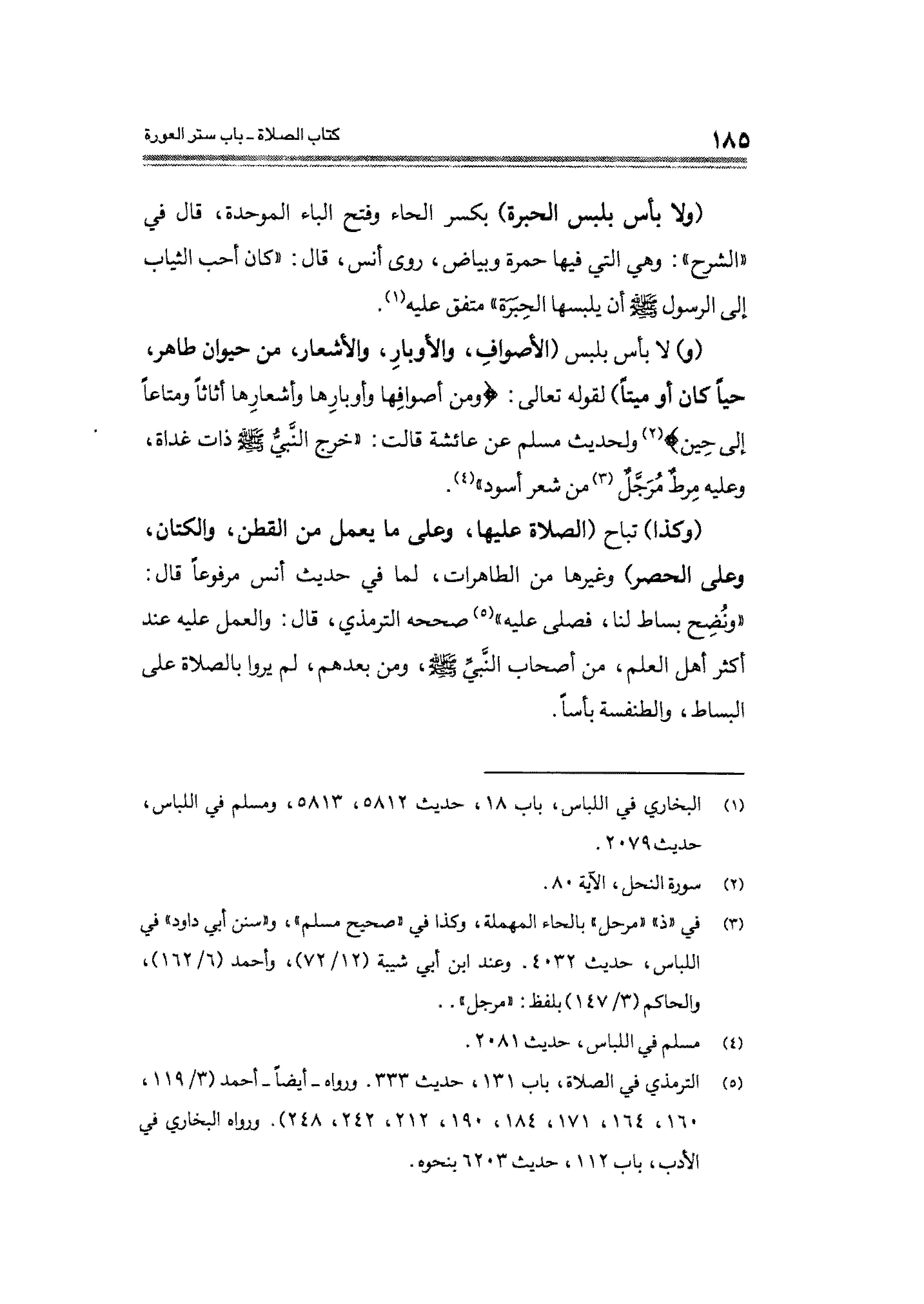 (و) لا بأس بلبس (الأصوافِ، والأوبارِ، والأشعار، من حيوان طاهر، حيًّا كان أو ميتًا) لقوله تعالى: {وَمِنْ أَصْوَافِهَا وَأَوْبَارِهَا وَأَشْعَارِهَا أَثَاثًا وَمَتَاعًا إِلَى حِينٍ} (¬٢) ولحديث مسلم عن عائشة قالت: "خرج النَّبيُّ - صلى الله عليه وسلم - ذات غداة، وعليه مِرطٌ مُرَجَّلٌ (¬٣) من شعر أسود" (¬٤).