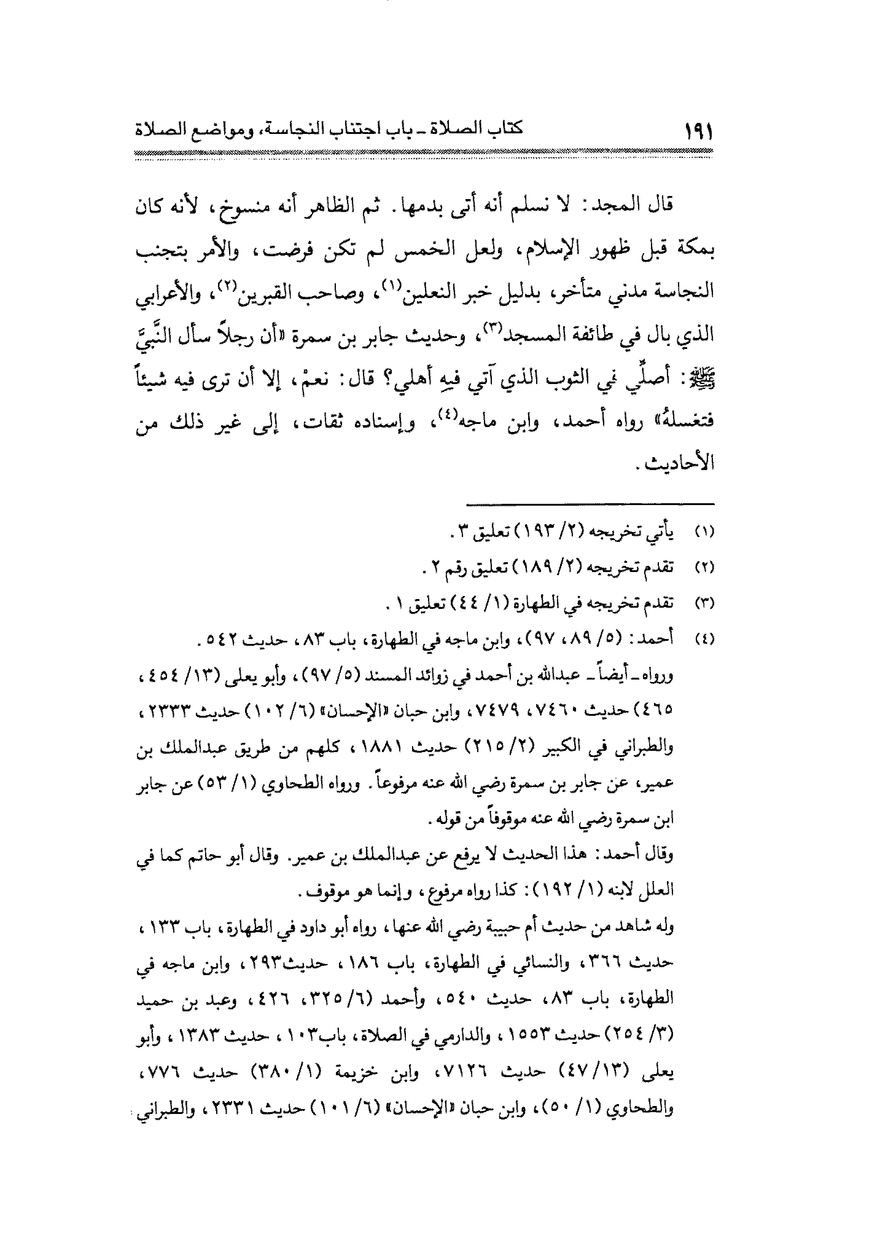 قال المجد: لا نسلم أنه أتى بدمها. ثم الظاهر أنه منسوخ، لأنه كان بمكة قبل ظهور الإِسلام، ولعل الخمس لم تكن فرضت، والأمر بتجنب النجاسة مدني متأخر، بدليل خبر النعلين (¬١)، وصاحب القبرين (¬٢)، والأعرابي الذي بال في طائفة المسجد (¬٣)، وحديث جابر بني سمرة "أنَّ رجلًا سأل النبي - صلى الله عليه وسلم -: أصلي في الثوب الذي آتى فيه أهلي؟ قال: نعم، إلا أن ترى فيه شيئًا فتغسله" رواه أحمد، وابن ماجه (¬٤)، وإسناده ثقات، إلى غير ذلك من الأحاديث.