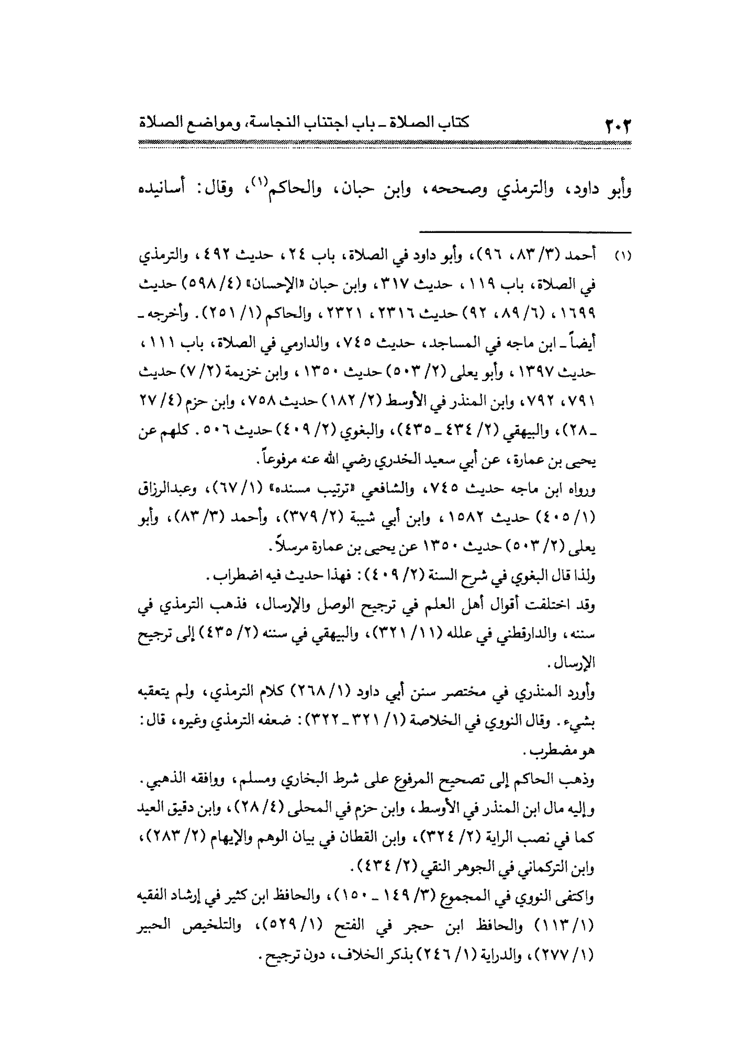 (¬١) أحمد (٣/ ٨٣، ٩٦)، وأبو داود في الصلاة، باب ٢٤، حديث ٤٩٢، والترمذي في الصلاة، باب ١١٩، حديث ٣١٧، وابن حبان "الإحسان" (٤/ ٥٩٨) حديث ١٦٩٩، (٦/ ٨٩، ٩٢) حديث ٢٣١٦، ٢٣٢١ والحاكم (١/ ٢٥١). وأخرجه - أيضًا- ابن ماجه في المساجد، حديث ٧٤٥، والدارمي في الصلاة، باب ١١١، حديث ١٣٩٧، وأبو يعلى (٢/ ٥٠٣) حديث ١٣٥٠، وابن خزيمة (٢/ ٧) حديث ٧٩١، ٧٩٢، وابن المنذر في الأوسط (٢/ ١٨٢) حديث ٧٥٨، وابن حزم (٤/ ٢٧ - ٢٨)، والبيهقي (٢/ ٤٣٤ - ٤٣٥)، والبغوى (٢/ ٤٠٩) حديث ٥٠٦. كلهم عن يحيى بن عمارة، عن أبي سعيد الخدري رضي الله عنه مرفوعًا.