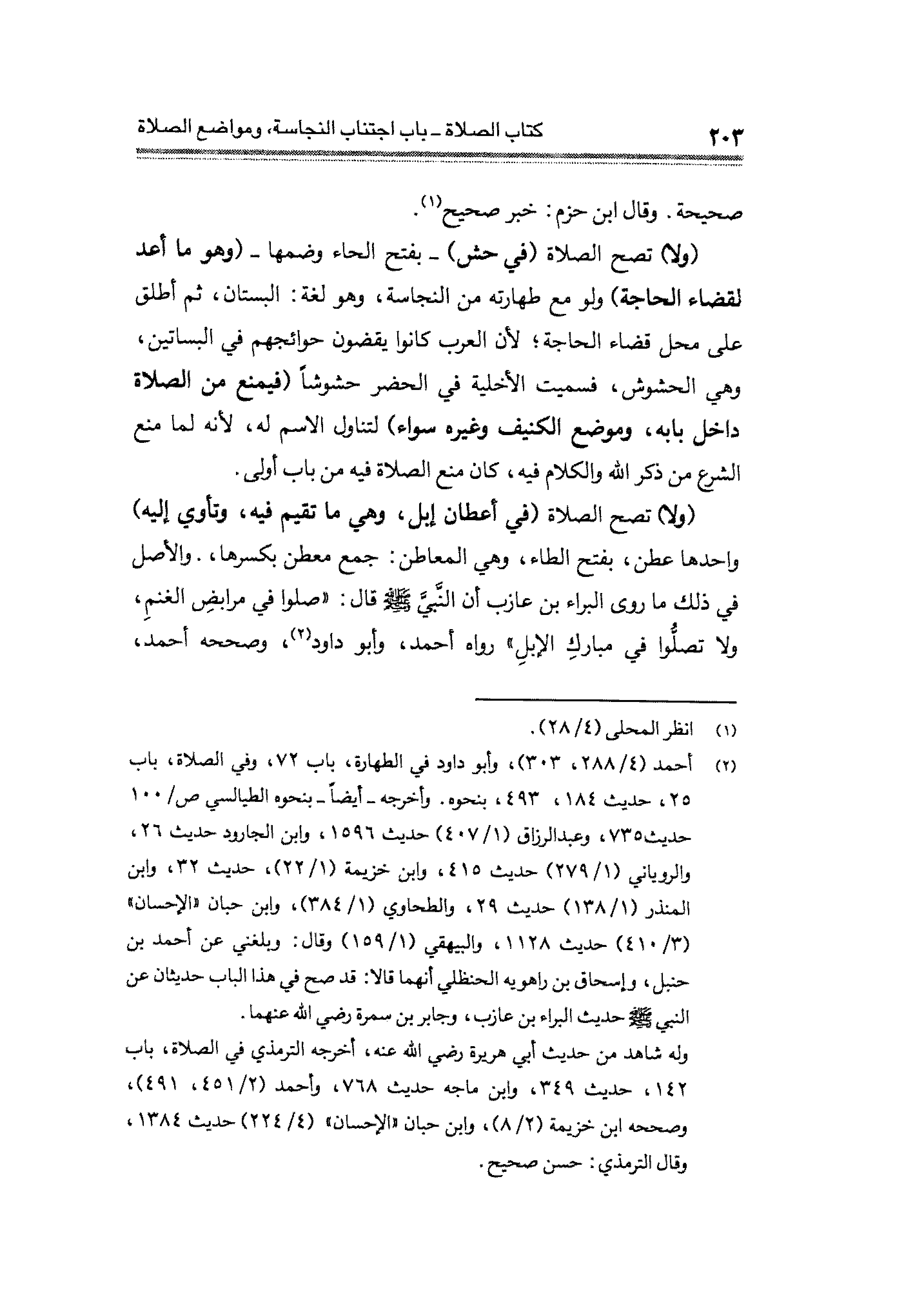 (ولا) تصح الصلاة (في أعطان إبل، وهي ما تقيم فيه، وتأوي إليه) واحدها عطن، بفتح الطاء، وهي المعاطن: جمع معطن بكسرها، والأصل في ذلك ما روى البراء بن عازب أن النَّبيَّ - صلى الله عليه وسلم - قال: "صلوا في مرابضِ الغنمِ، ولا تصلُّوا في مباركِ الإبلِ" رواه أحمد، وأبو داود (¬٢)، وصححه أحمد،