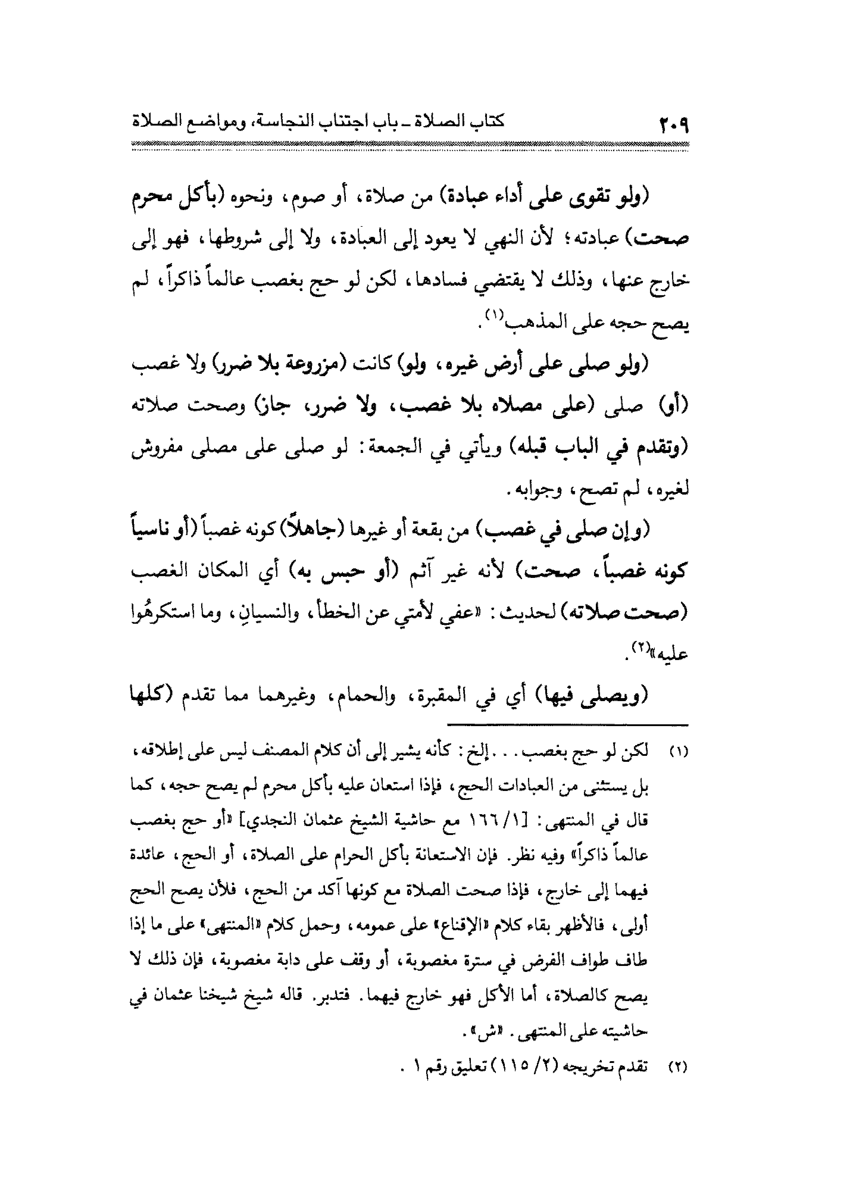 (¬١) لكن لو حج يغصب ... إلخ: كأنه يشير إلى أن كلام المصنف ليس على إطلاقه، بل يستثنى من العبادات الحج، إذا استعان عليه بمأكل محرم لم يصح حجه، كما قال في المنتهى: [١/ ١٦٦ مع حاشية الشيخ عثمان النجدي] "أو حج بغصب عالمًا ذاكرًا"، وفي نظر، فإن الاستعانة بأكل الحرام على الصلاة، أو الحج، عائدة فيهما إلى خارج، فإذا صحت الصلاة مع كونها آكد من الحج، فلأن يصح الحج أولى، فالأظهر بقاء كلام "الإقناع" على عمومه، وحمل كلام "المنتهى" على ما إذا طاف طواف الفرض في سترة مغصوبة، أو وقف على دابة مغصوبة، فإن ذلك لا يصح كالصلاة أما الأكل فهو خارج فيهما -فتدبر- قاله شيخ شيخنا عثمان في حاشية على المنتهى. "ش".