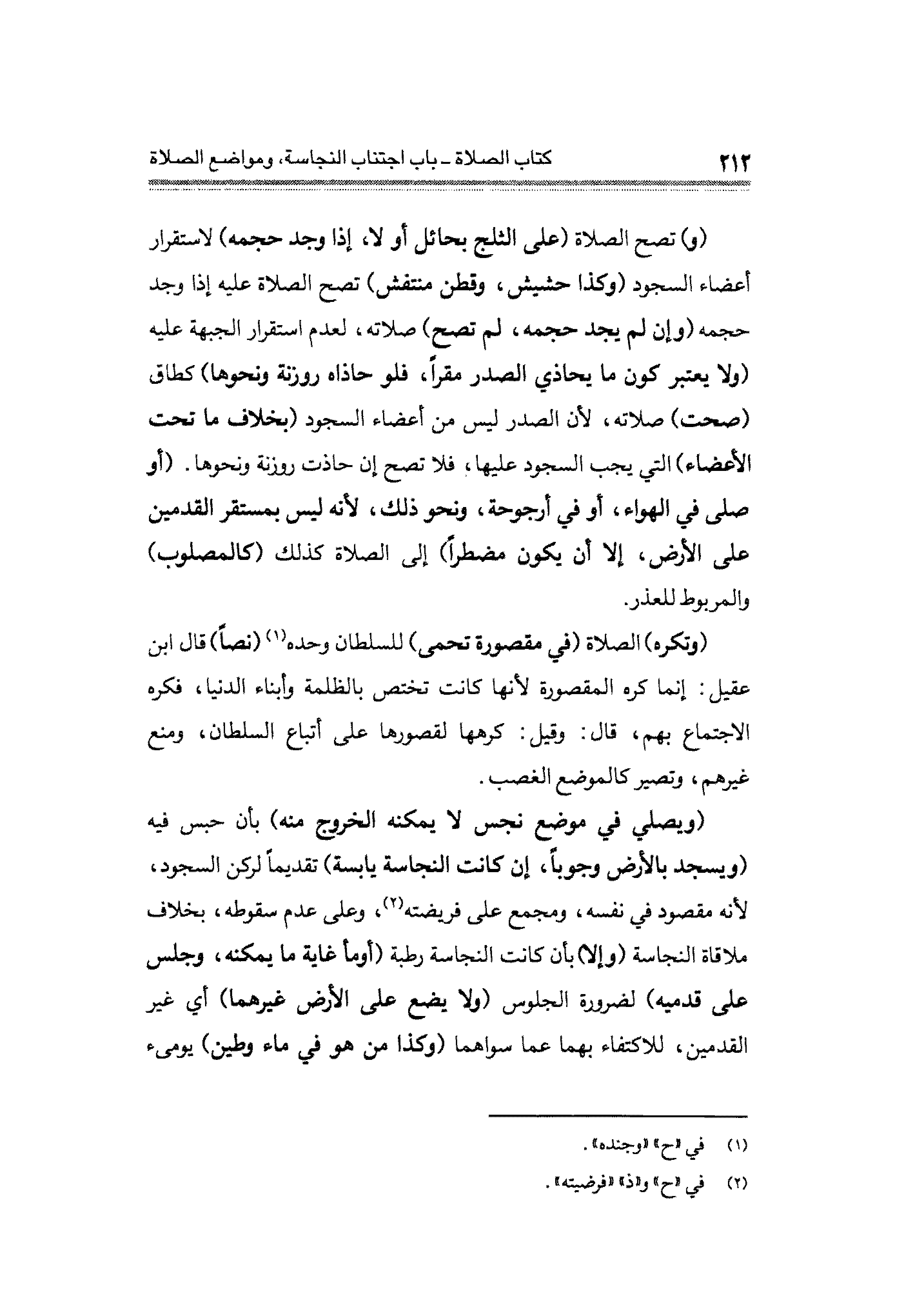 (و) تصح الصلاة (على الثلج بحائل أو لا، إذا وجد حجمه) لاستقرار أعضاء السجود أو كذا حشيش، وقطن منتفش) تصح الصلاه عليه إذا وجد حجمه (وإن لم يجد حجمه، لم تصح) صلاته، لعدم استقرار الجبهة عليه (ولا يعتبر كون ما يحاذي الصدر مقرًّا، فلو حاذاه روزنة ونحوها) كطاق (صحت) صلاته؛ لأن الصدر من أعضاء السجود (بخلاف ما تحت الأعضاء) التي يجب السجود عليها، فلا تصح إن حاذت روزنة ونحوها. (أو صلى في الهواء، أو في أرجوحة، ونحو ذلك؛ لأنه ليس بمستقر القدمين على الأرض، إلا أن يكون مضطرًا) إلى الصلاة كذلك (كالمصلوب) والمربوط للعذر.