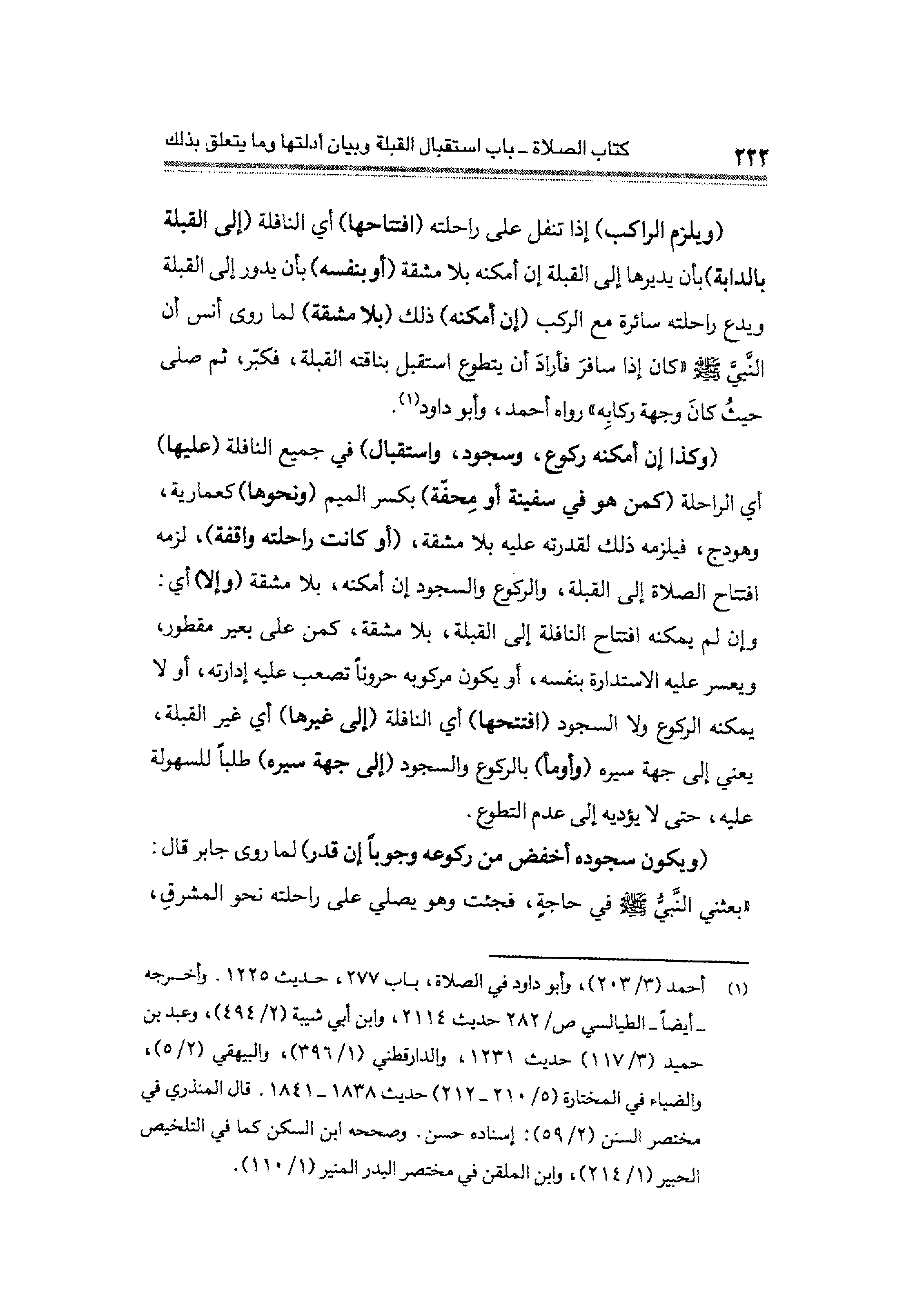 (ويلزم الراكب) إذا تنفل على راحلته (افتتاحها) أي النافلة (إلى القبلة بالدابة) بأن يديرها إلى القبلة إن أمكنه بلا مشقة (أو بنفسه) بأن يدور إلى القبلة ويدع راحلته سائرة مع الركب (إن أمكنه) ذلك (بلا مشقة) لما روى أنس أن النَّبيُّ - صَلَّى الله عليه وسلم - "كان إذا سافرَ فأرادَ أن يتطوع استقبل بناقته القبلة، فكبر، ثم صلى حيثُ كانَ وجهة ركابِه"، رواه أحمد، وأبو داود (¬١).