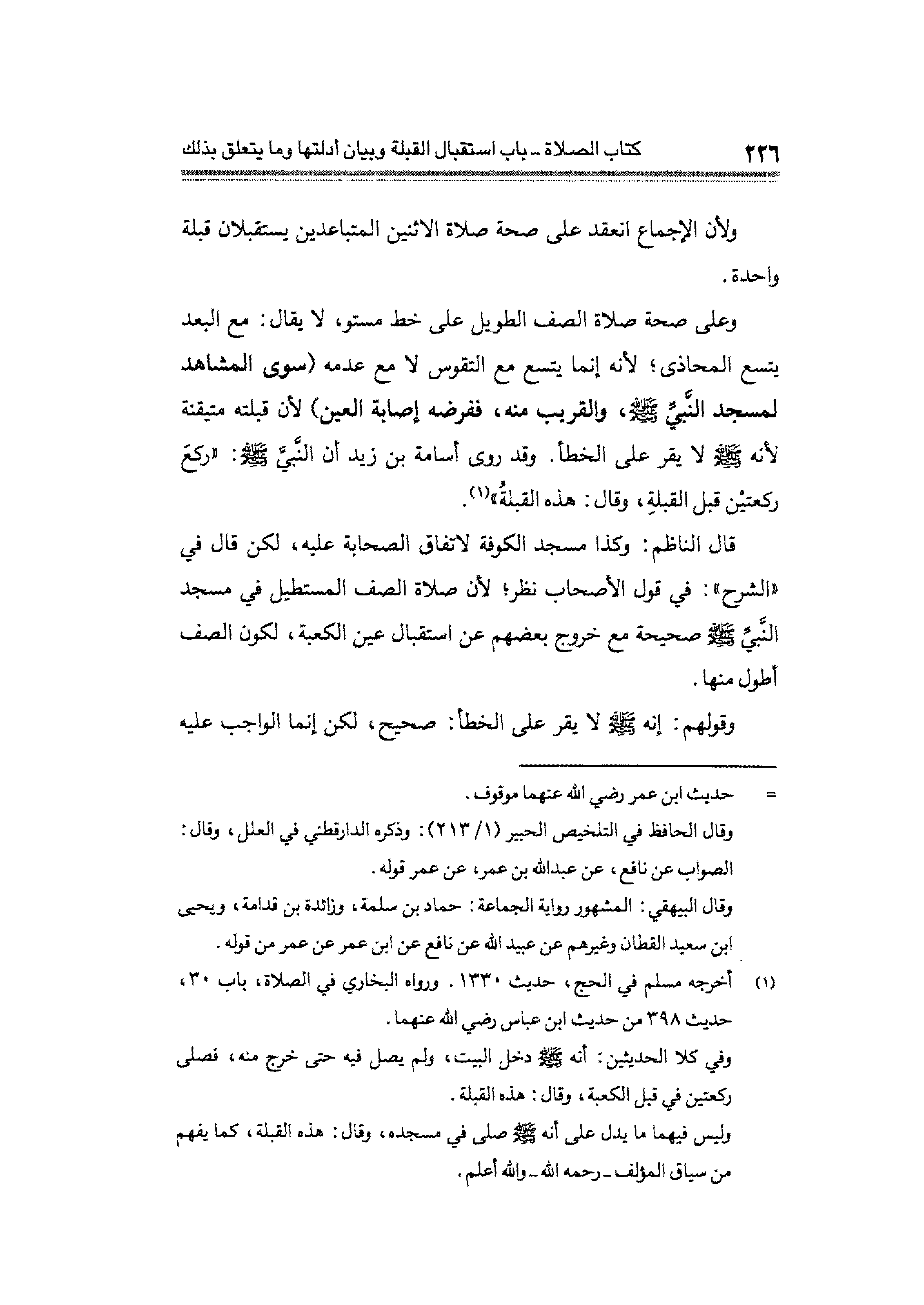 وعلى صحة صلاة الصف الطويل على خط مستو، لا يقال: مع البعد يتسع المحاذى؛ لأنَّه إنَّما يتسع مع التقوس لا مع عدمه (سوى المشاهد لمسجد النَّبي - صَلَّى الله عليه وسلم -، والقريب منه، ففرضه إصابة العين) لأنَّ قبلته متيقنة لأنَّه - صَلَّى الله عليه وسلم - لا يقر على الخطأ. وقد روى أسامة بن زيد أن النَّبيّ - صَلَّى الله عليه وسلم -: "ركعَ ركعتين قبل القبلةِ، وقال: هذه القبلة" (¬١).