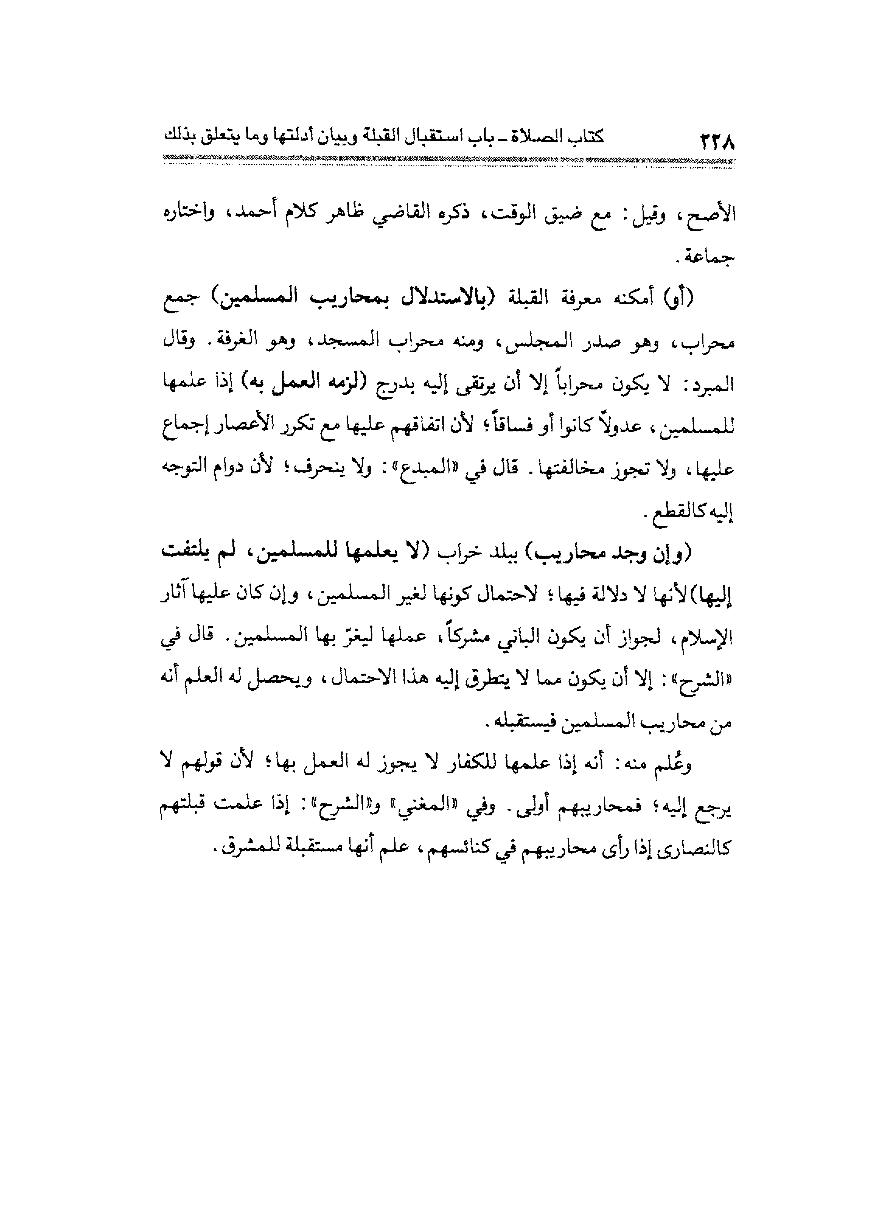 (وإن وجد محاريب) ببلد خراب (لا يعلمها للمسلمين، لم يلتفت إليها) لأنَّه لا دلالة فيها؛ لاحتمال كونها لغير المسلمين، وإن كان عليها آثار الإسلام، لجواز أن يكون الباني مشركًا، عملها ليغرّ بها المسلمين. قال في "الشرح": إلَّا أن يكون مما لا يتطرق إليه هذا الاحتمال، ويحصل له العلم أنه من محاريب المسلمين فيستقبله.