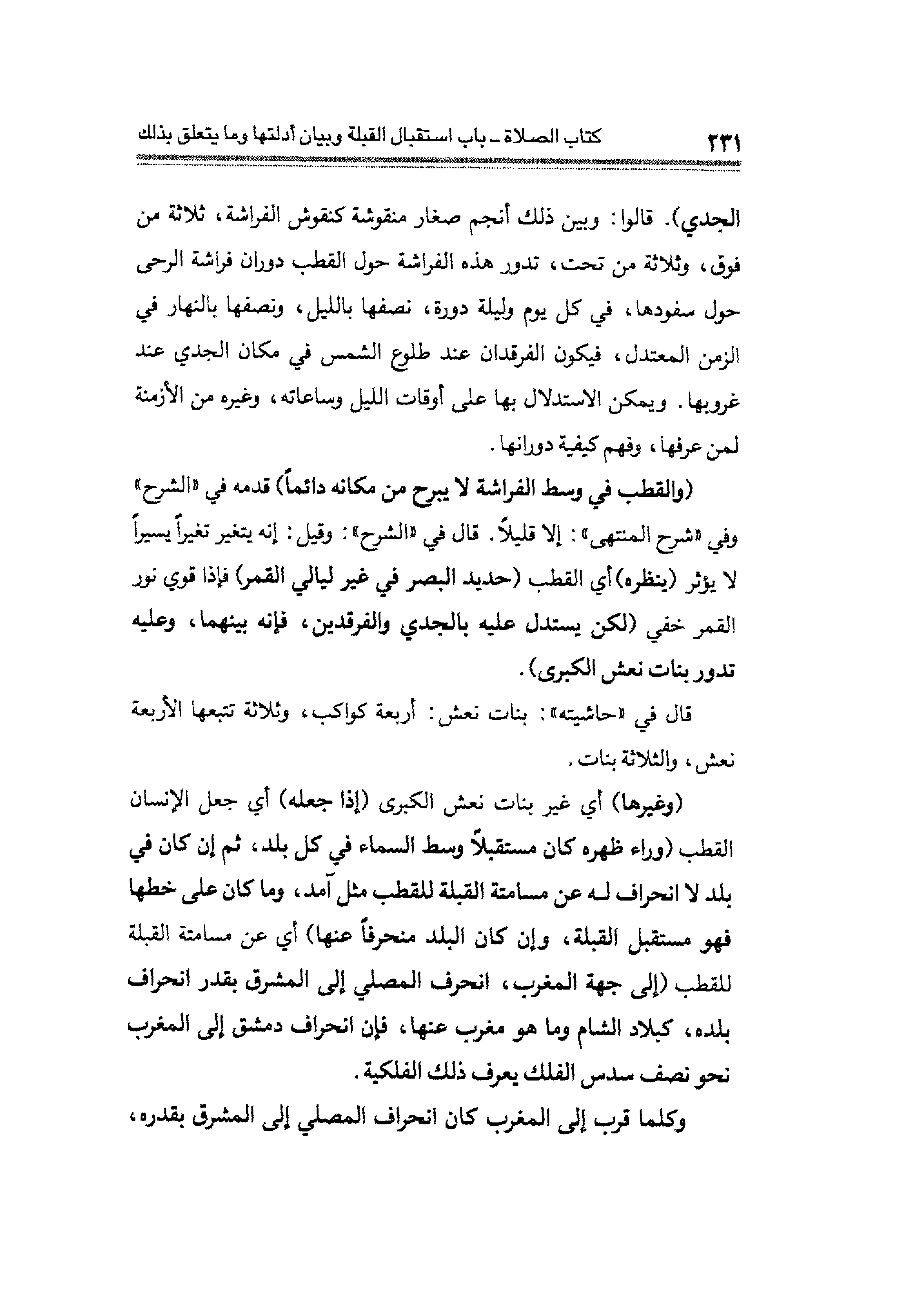 (وغيرها) أي غير بنات نعش الكبرى (إذا جعله) أي جعل الإنسان القطب (وراء ظهره كان مستقبلًا وسط السماء في كل بلد، ثم إن كان في بلد لا انحراف له عن مسامتة القبلة للقطب مثل آمد، وما كان على خطها فهو مستقبل القبلة، وإن كان البلد منحرفًا عنها) أي عن مسامتة القبلة للقطب (إلى جهة المغرب، انحرف المصلى إلى المشرق بقدر انحراف بلده، كبلاد الشام وما هو مغرب عنها، فإن انحراف دمشق إلى المغرب نحو نصف سدس الفلك يعرف ذلك الفلكية.