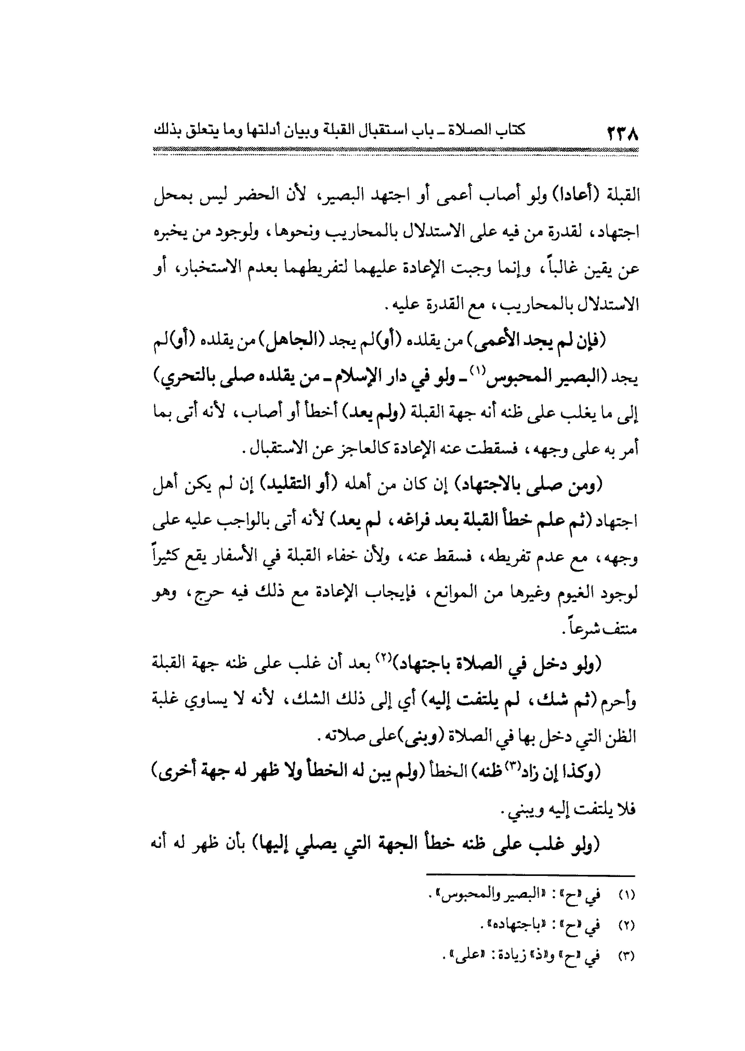 القبلة (أعادا) ولو أصاب أعمى أو اجتهد البصير، لأن الحضر ليس بمحل اجتهاد، لقدرة من فيه على الاستدلال بالمحاريب. ونحوها، ولوجود من يخبره عن يقين غالبًا، وإنما وجبت الإعادة عليهما لتفريطهما بعدم الاستخبار، أو الاستلال بالمحاريب، مع القدرة عليه.