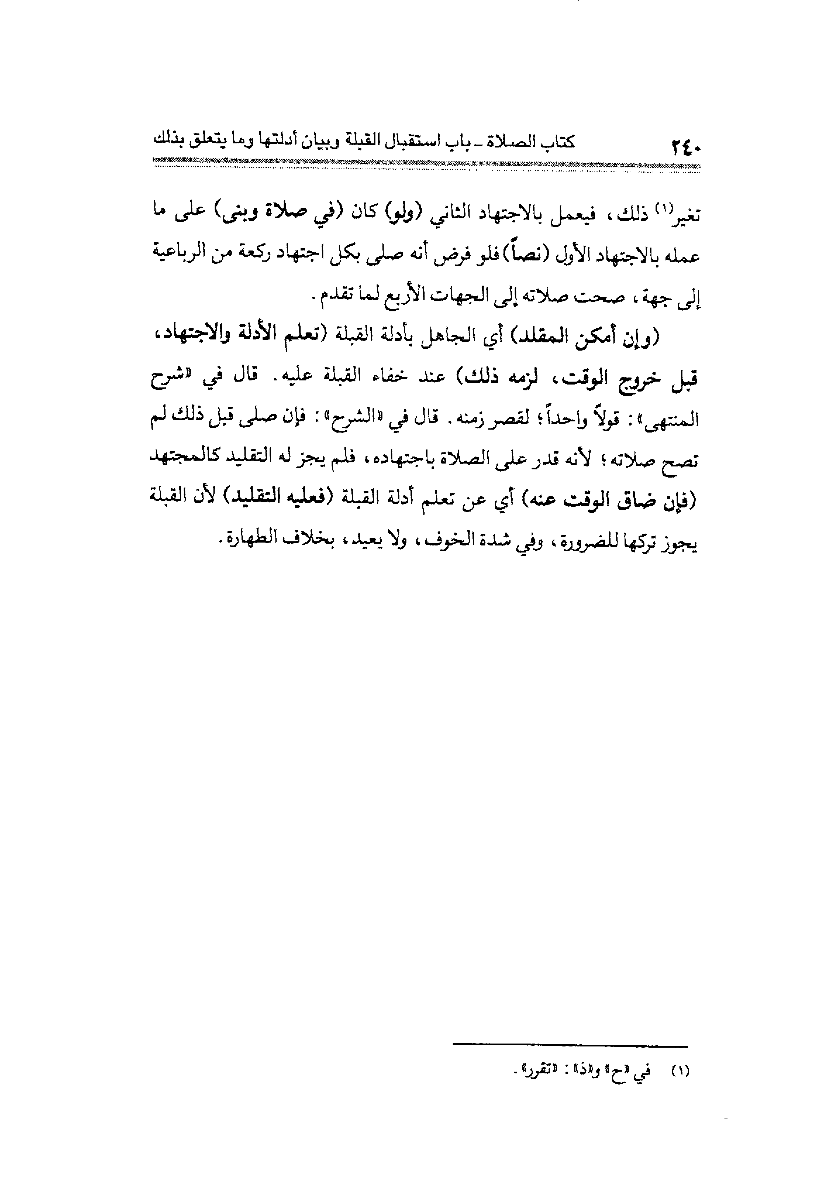 (وإن أمكن المقلد) أي الجاهل بأدلة القبلة (تعلم الأدلة والاجتهاد، قبل خروج الوقت، لزمه ذلك) عند. خفاء القبلة عليه. قال في "شرح المنتهي": قولًا واحدًا؛ لقصر زمنه. قال في "الشرح": فإن صلى قيل ذلك لم تصح صلاته؛ لأنه قدر على الصلاة باجتهاده، فلم يجز له التقليد كالمجتهد (فإن ضاق الوقت عنه) أي عن تعلم أدلة القبلة (فعليه التقليد) لأن القبلة يجوز تركها للضرورة، وفي شدة الخوف، ولا يعيد، بخلاف الطهارة.
