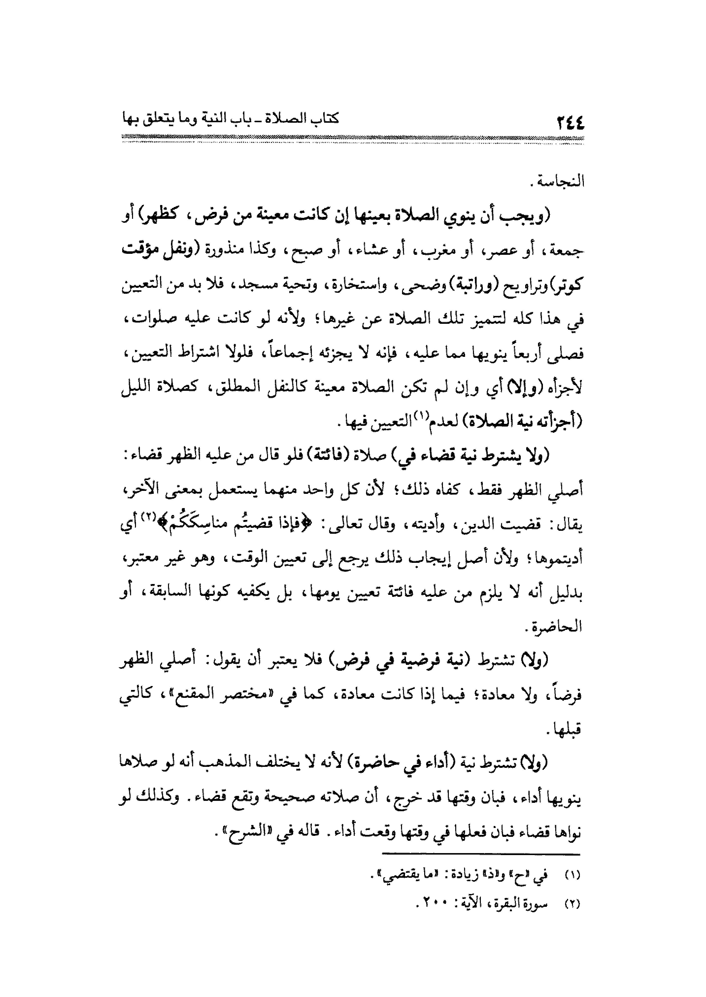 (ولا يشترط نية قضاء في) صلاة (فائتة) فلو قال من عليه الظهر قضاء: أصلي الظهر فقط، كفاه ذلك؛ لأن كل واحد منهما يستعمل بمعنى الآخر، يقال: قضيت الدين، وأديته، وقال تعالى: {فَإِذَا قَضَيِتُمْ مَنَاسِكَكُمْ} (¬٢) أي أديتموها؛ ولأن أصل إيجاب ذلك يرجع إلى تعيين الوقت، وهو غير معتبر، بدليل أنَّه لا يلزم من عليه فائتة تعيين يومها؛ بل يكفيه كونها السابقة، أو الحاضرة.