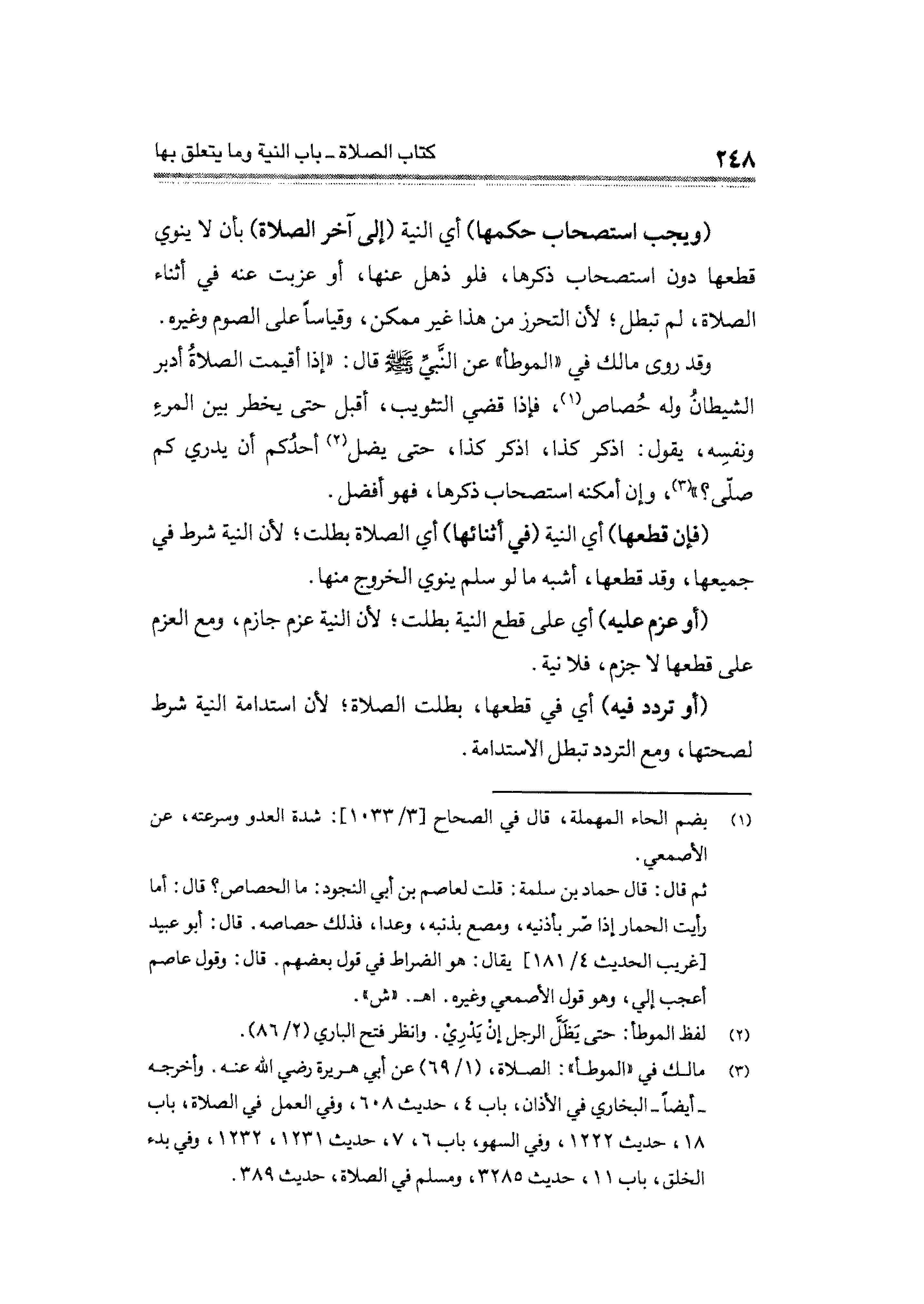 وقد روى مالك في "الموطأ" عن النَّبيِّ - صلى الله عليه وسلم - قال: "إذا أقيمت الصلاةُ أدبر الشيطانُ وله حُصاص (¬١)، فإذا قضي التثويب، أقبل حتَّى يخطر بين المرءِ ونفسِه، يقول: اذكر كذا، اذكر كذا، حتَّى يضل (¬٢) أحدُكم أن يدري كم صلّي؟ " (¬٣)، وإن أمكنه استصحاب ذكرها، فهو أفضل.