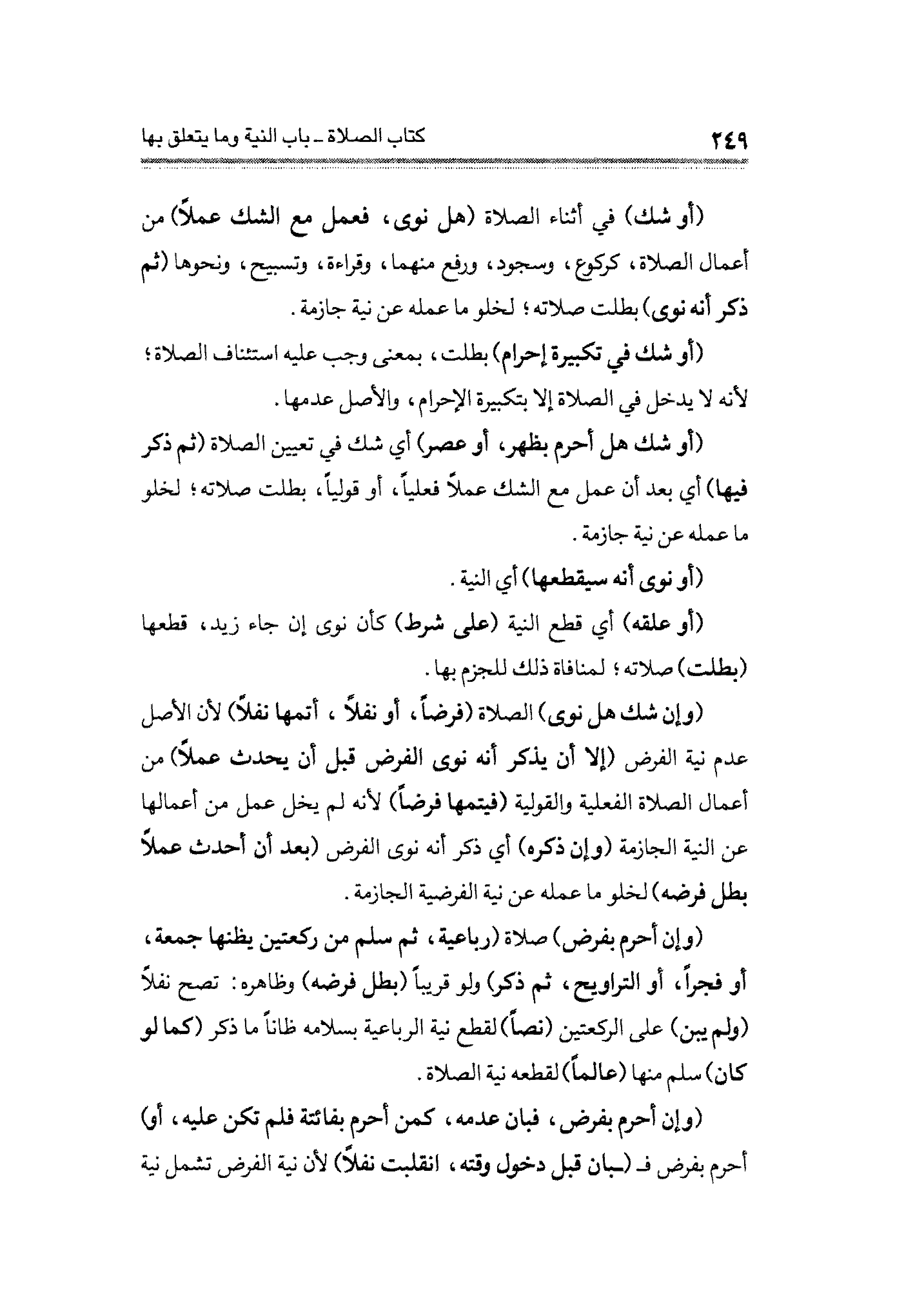 (وإن شك هل نوى) الصلاة (فرضاً، أو نفلاً، أتمها نفلاً) لأنَّ الأصل عدم نية الفرض (إلا أن يذكر أنَّه نوى الفرض قبل أن يحدث عملًا) من أعمال الصَّلاة الفعلية والقوية (فيتمها فرضاً) لأنَّه لم يخل عمل من أعمالها عن النيَّة الجازمة (وإن ذكره) أي ذكر أنَّه نوى الفرض (بعد أن أحدث عملاً بطل فرضه) لخلو ما عمله عن نية الفرضية الجازمة.