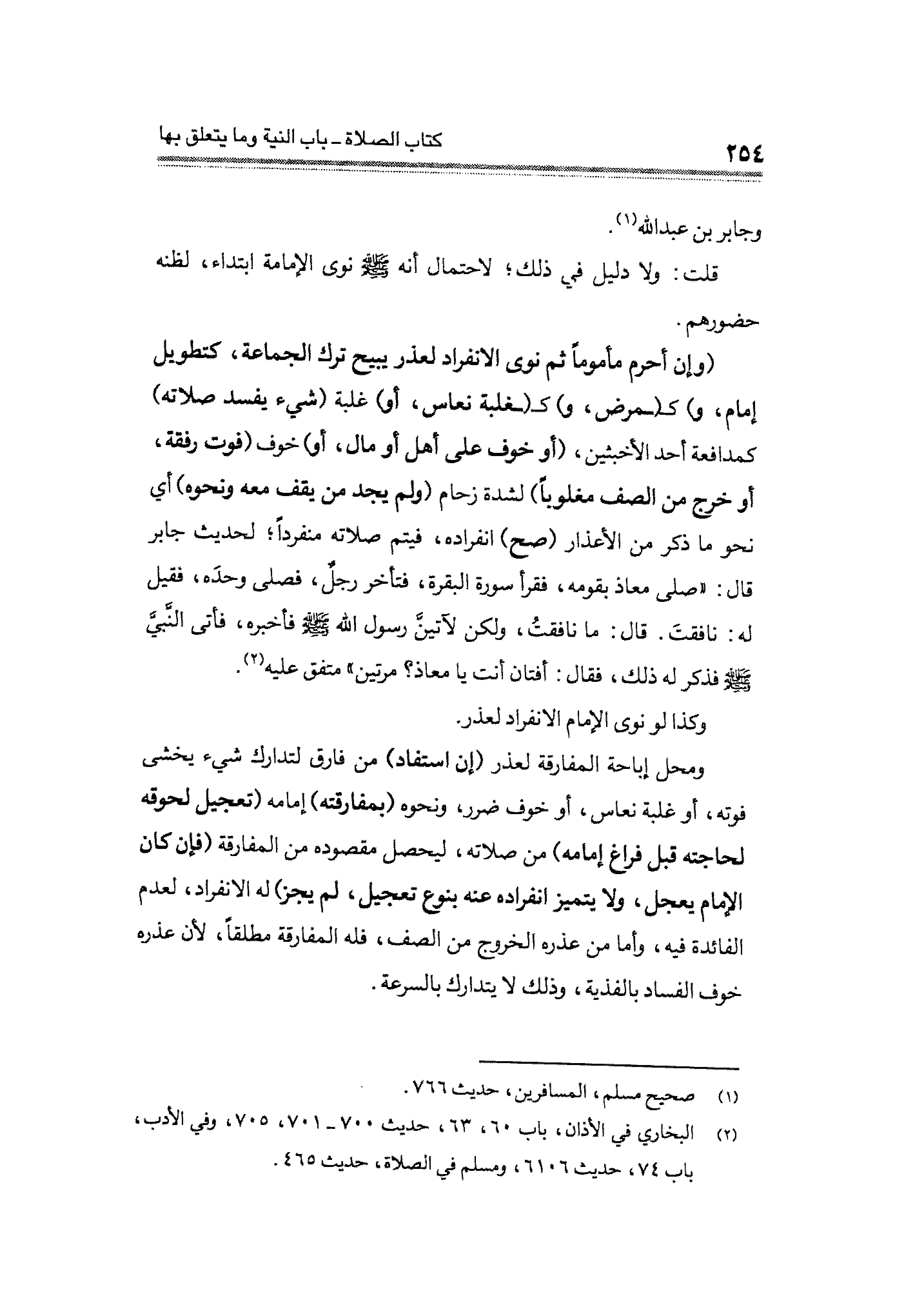 (وإن أحرم مأموماً ثم نوى الانفراد لعذر يبيح ترك الجماعة، كتطويل إمام، و) كـ (ـمرض، و) كـ (ـغلبة نعاس، أو) غلبة (شيء يفسد صلاته) كمدافعة أحد الأخبثين، (أو خوف على أهل أو مال، أو) خوف (فوت رفقة، أو خرج من الصف مغلوباً) لشدة زحام (ولم يجد من يقف معه ونحوه) أي نحو ما ذكر من الأعذار (صح) انفراده، فيتم صلاته. منفرداً؛ لحديث جابر قال: "صَلَّى معاذ بقومه، فقرأ سورة البقرة، فتأخر رجلٌ، فصلَّى وحدَه، فقيل له: نافقتَ. قال: ما نافقت، ولكن لآتينَّ رسول الله - صلى الله عليه وسلم - فأخبره، فأتي النبي - صلى الله عليه وسلم - فذكر له ذلك، فقال: أفتان أنت يا معاذ؟ مرتين" متَّفقٌ عليه (¬٢).