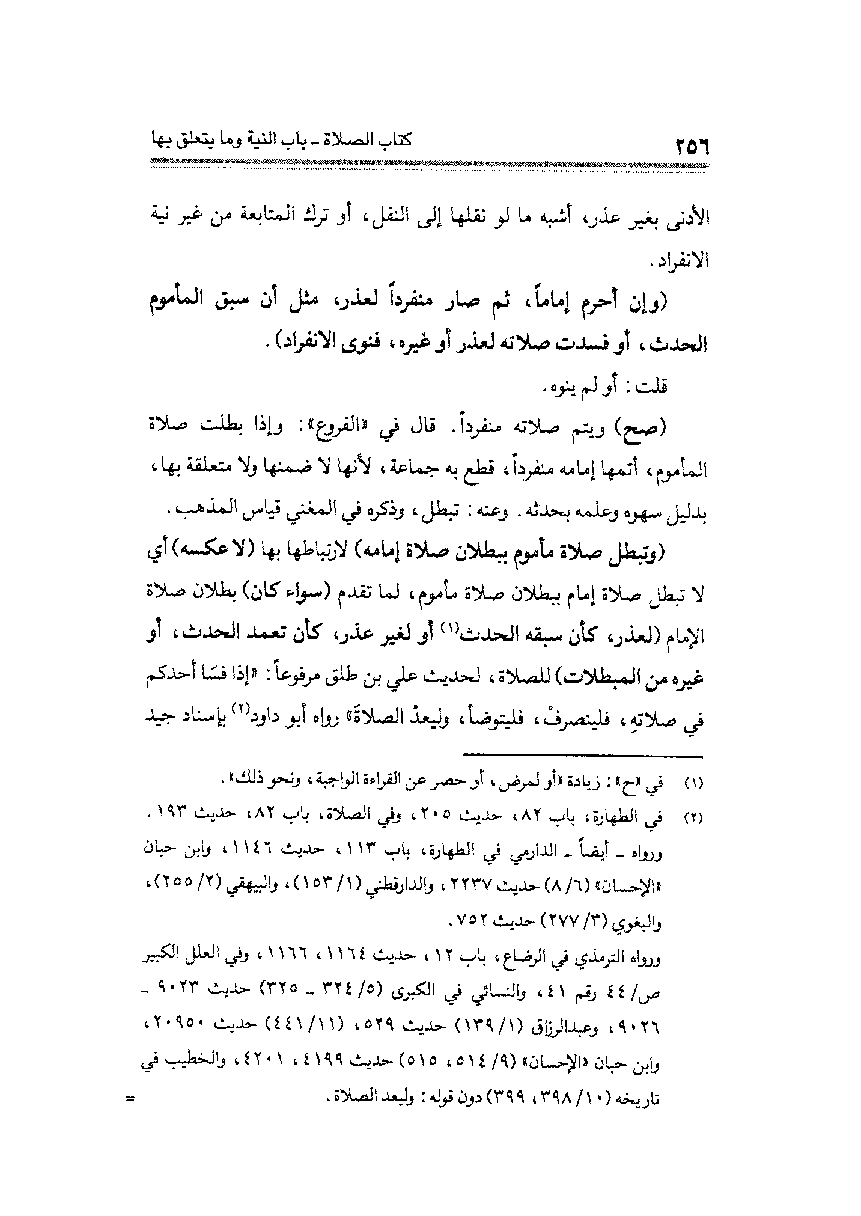 (وتبطل صلاة مأموم ببطلان صلاة إمامه) لارتباطها بها (لا عكسه) أي لا تبطل صلاة إمام ببطلان صلاة مأموم، لما تقدم (سواء كان) بطلان صلاة الإمام (لعذر، كأن سبقه الحدث (¬١) أو لغير عذر، كأن تعمد الحدث، أو غيره من المبطلات) للصلاة، لحديث علي بن طلق مرفوعاً: "إذا فسَا أحدكم في صلاته، فلينصرف، فليتوضأ، وليعد الصلاةَ" رواه أبو داود (¬٢) بإسناد جيد