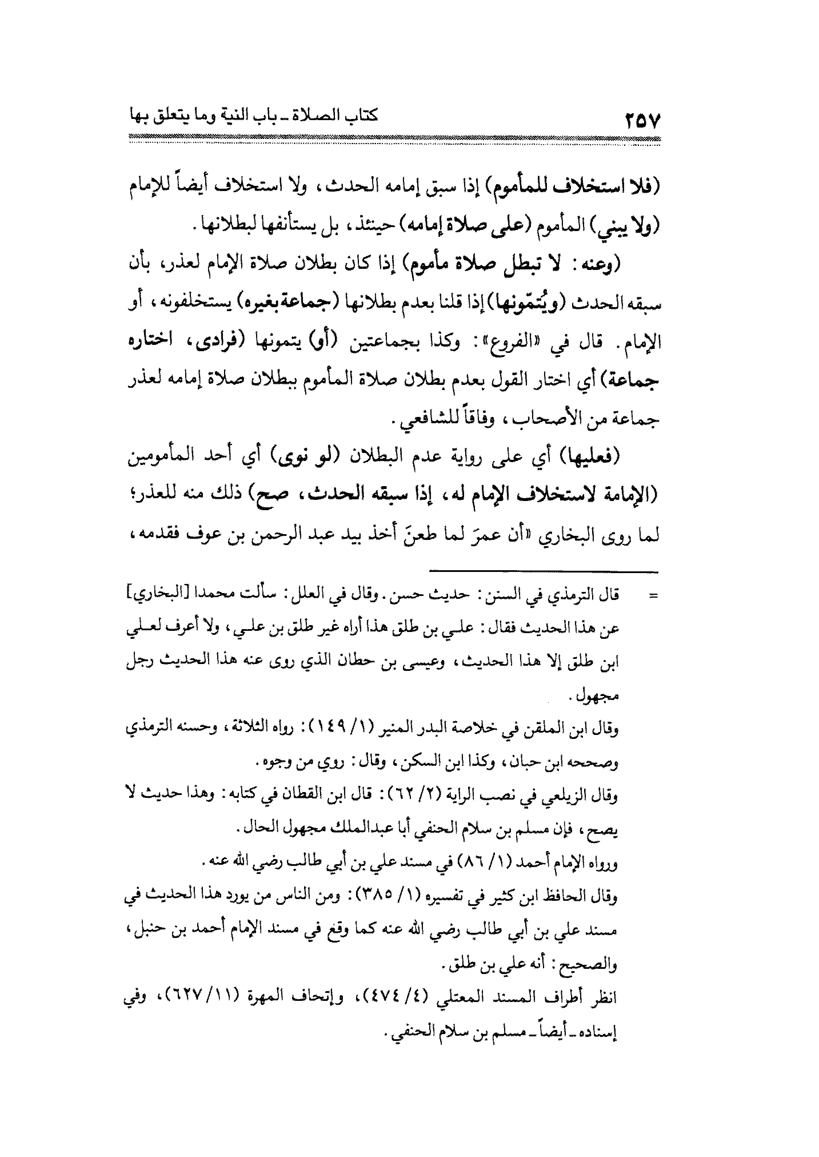 (وعنه: لا تبطل صلاة مأموم) إذا كان بطلان صلاة الإمام لعذر، بأن سبقه الحدث (ويُتمّونها) إذا قلنا بعدم بطلانها (جماعة بغيره) يستخلفونه، أو الإمام. قال في "الفروع": وكذا بجماعتين (أو) يتمُّونها (فرادى، اختاره جماعه) أي اختار القول بعدم بطلان صلاة المأموم ببطلان صَلَّاة إمامه لعذر جماعة من الأصحاب، وفاقاً للشافعي.
