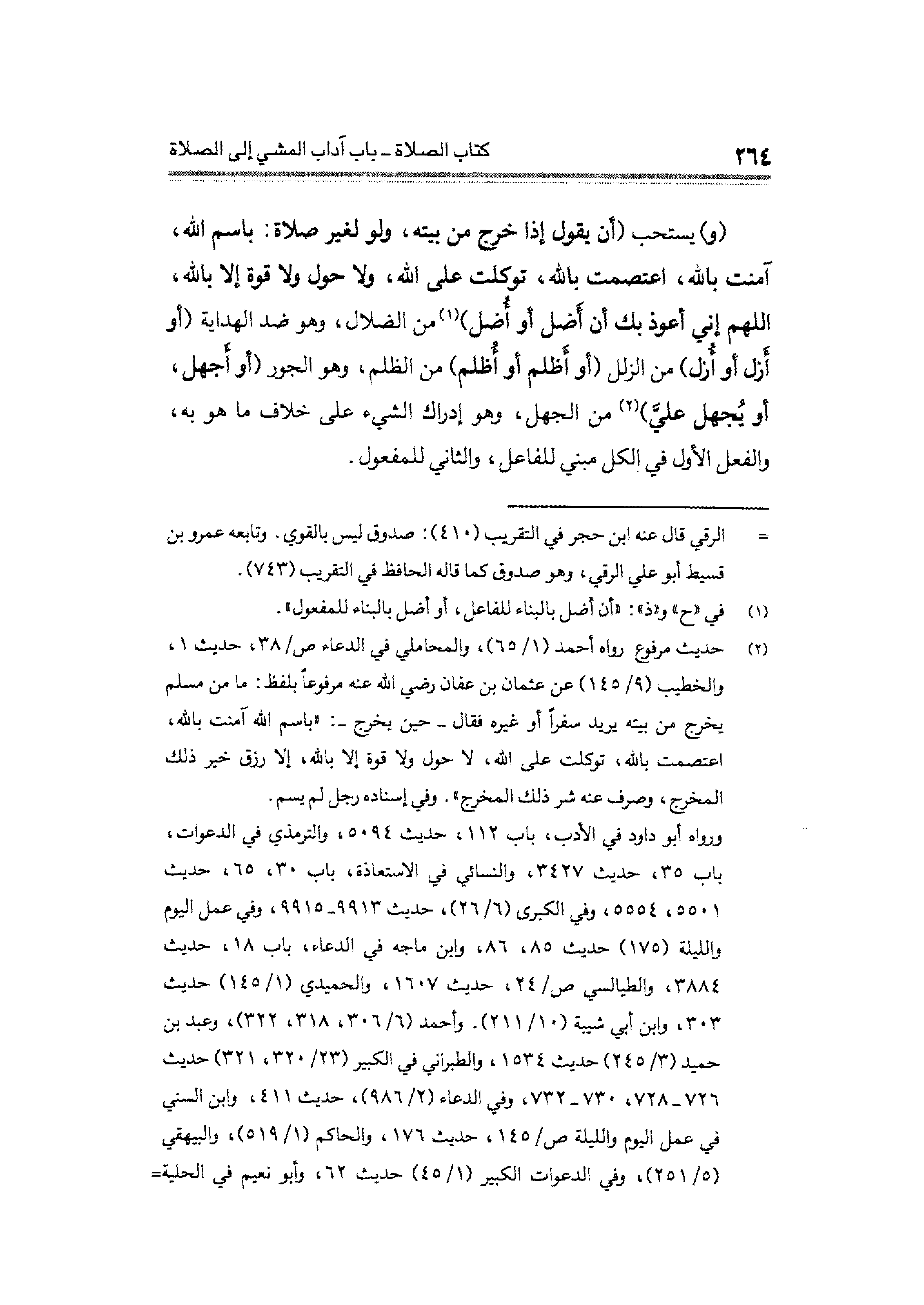 (¬٢) حديث مرفوع رواه أحمد (١/ ٦٥)، والمحاملي في الدعاء ص/٣٨، حديث ١، والخطيب (٩/ ١٤٥) عن عثمان بن عفان رضي الله عنه مرفوعًا بلفظ: ما من مسلم يخرج من بيته يريد سفرًا أو غيره فقال -حين يخرج-: " باسم الله آمنت بالله، اعتصمت بالله، توكلت على الله، لا حول ولا قوة إلا بالله، إلا رزق خير ذلك المخرج، وصرف عنه شر ذلك المخرج". وفي إسناده رجل لم يسم.