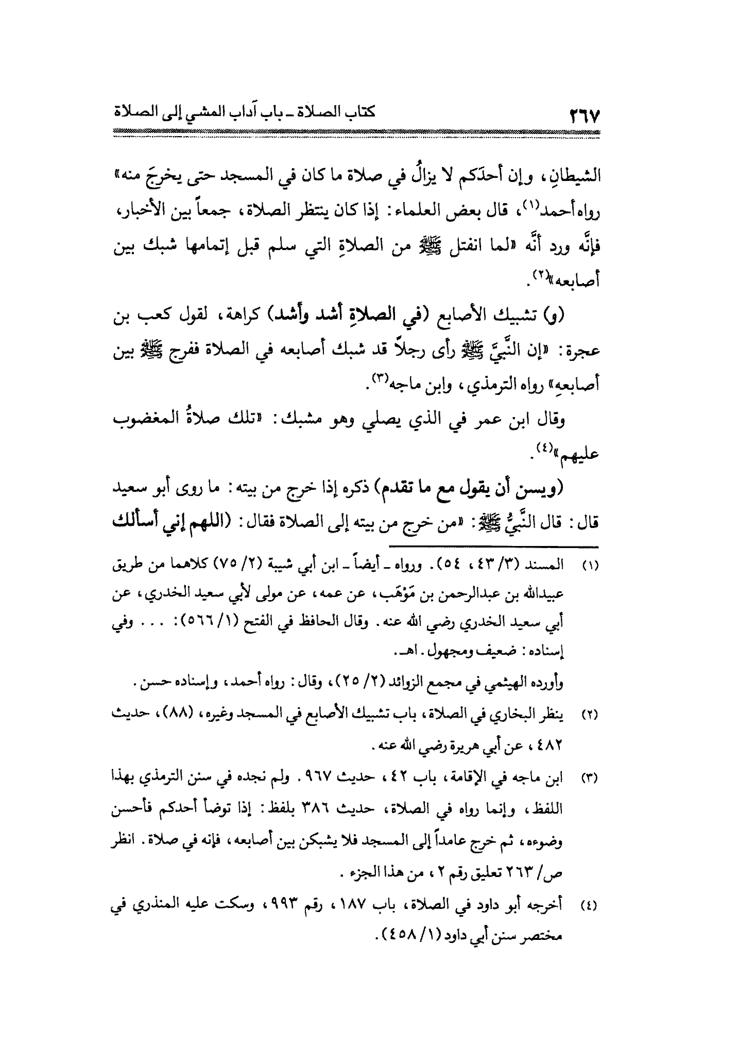 (¬٣) ابن ماجه في الإقامة، باب ٤٢، حديث ٩٦٧. ولم نجده في سنن الترمذي بهذا اللفظ، وإنما رواه في الصلاة، حديث ٣٨٦ بلفظ: إذا توضأ أحدكم فأحسن وضوءه، ثم خرج عامدًا إلى المسجد فلا يشبكن بين أصابعه، فإنه في صلاة. انظر ص/٢٦٣ تعليق رقم ٢، من هذا الجزء.