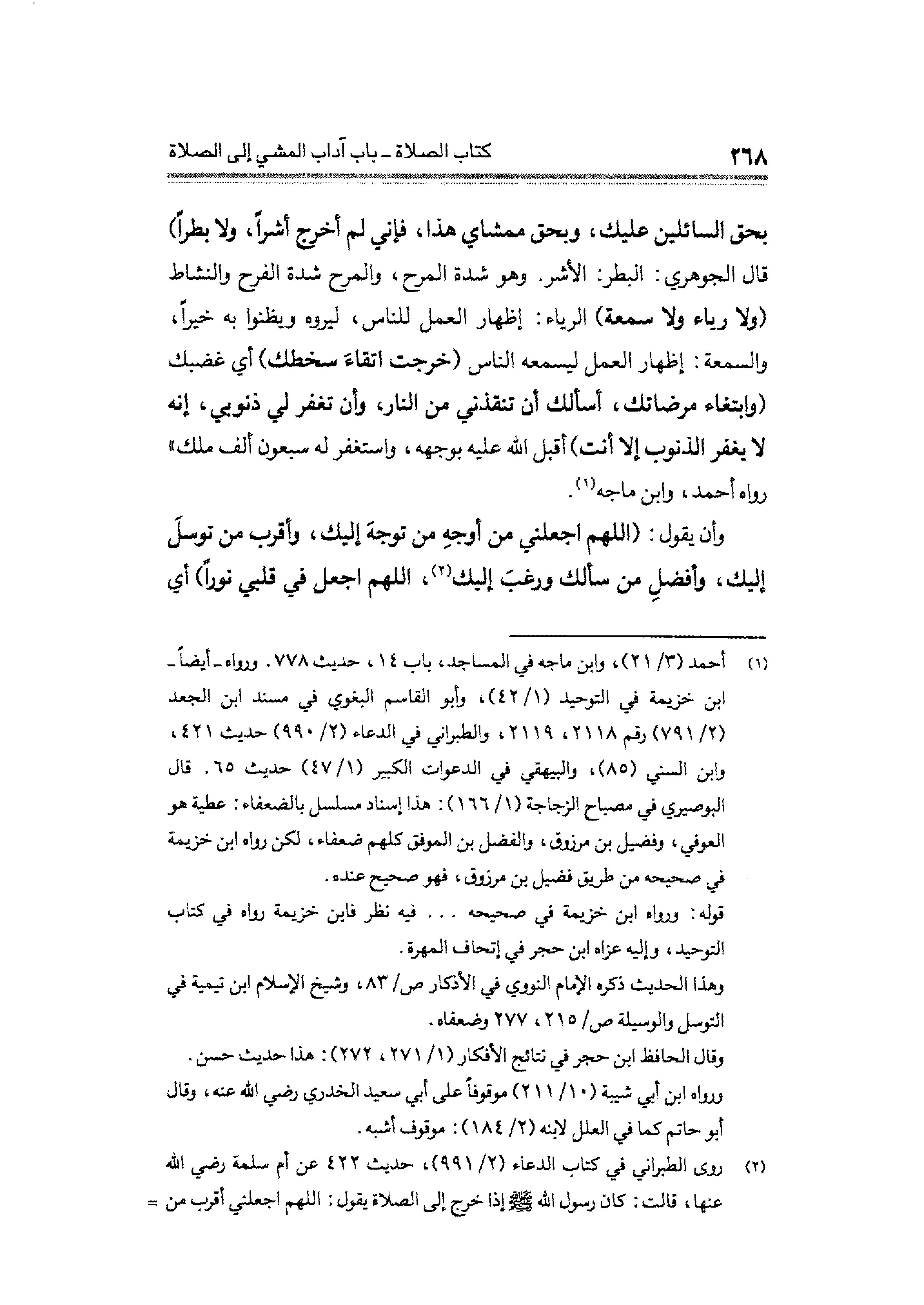 (¬٢) روى الطبراني في كتاب الدعاء (٢/ ٩٩١)، حديث ٤٢٢ عن أم سلمة رضي الله عنها، قالت: كان رسول الله - صلى الله عليه وسلم - إذا خرج إلى الصلاة يقول: اللهم اجعلني أقرب من =