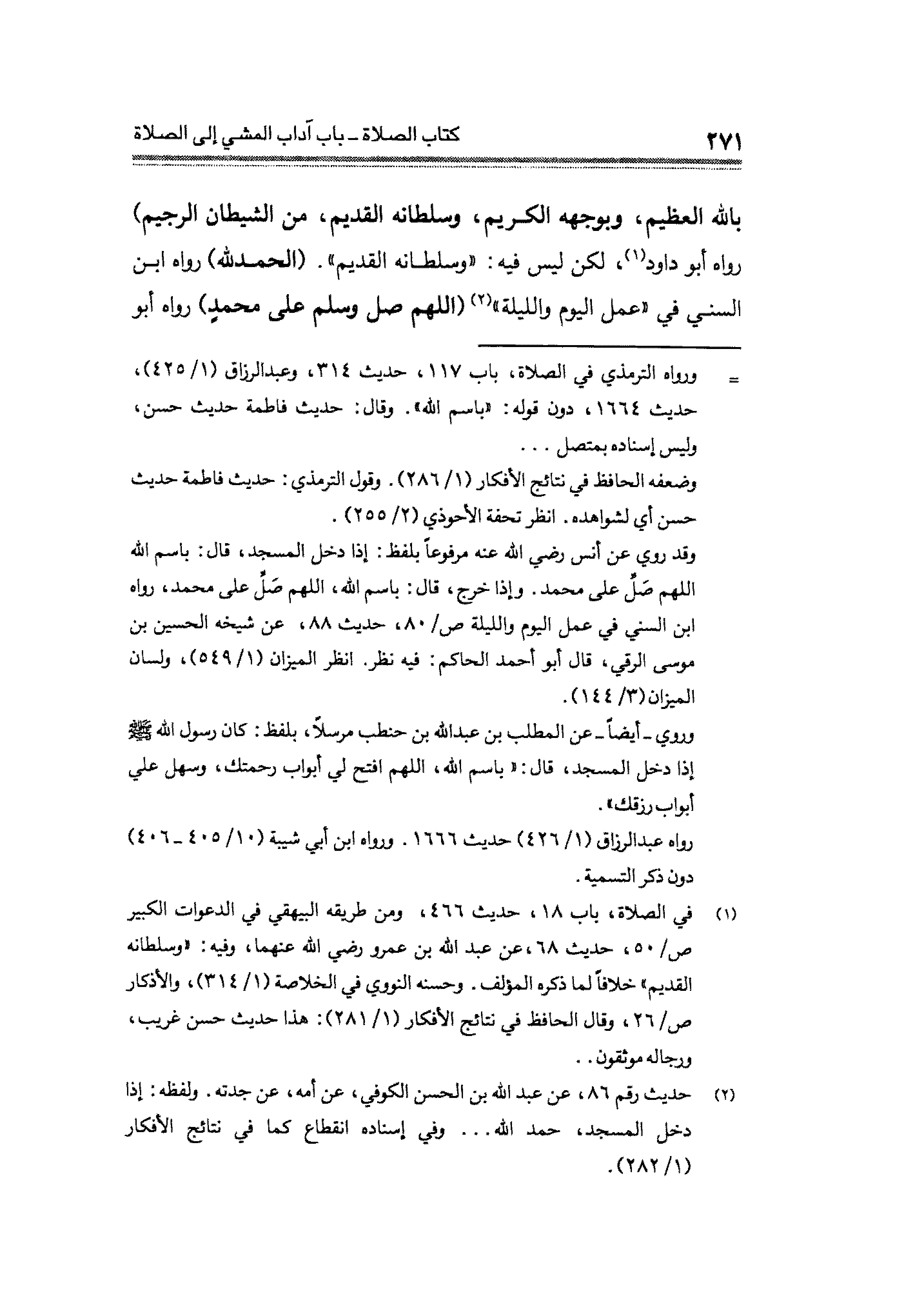 (¬٢) حديث رقم ٨٦، عن عبد الله بن الحسن الكوفي، عن أمه، عن جدته. ولفظه: إذا دخل المسجد، حمد الله ... وفي إسناده انقطاع كما في نتائج الأفكار (١/ ٣٨٢).