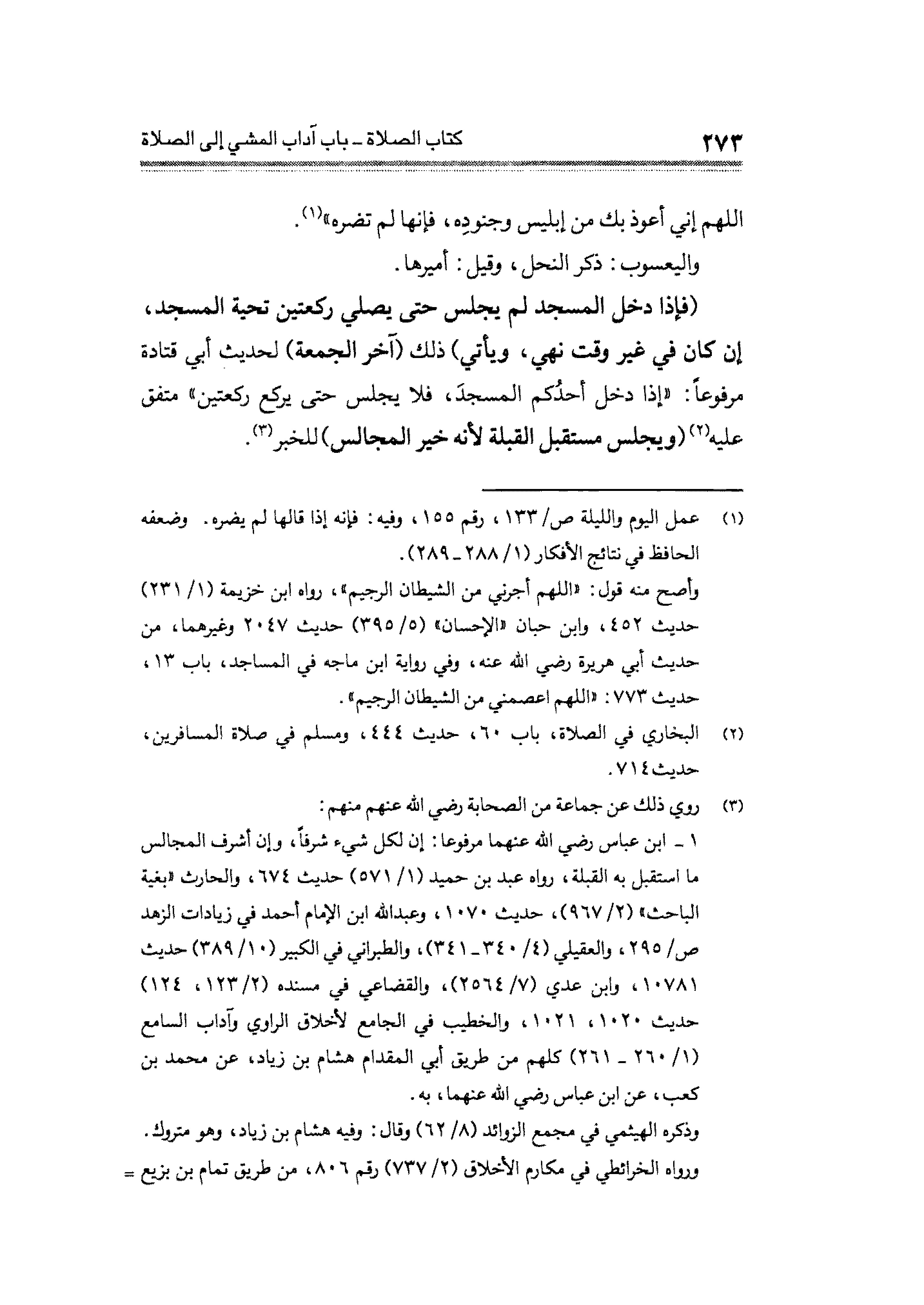 وأصح فيه قول: "اللهم أجرني من الشيطان الرجيم"، رواه ابن خزيمة (١/ ٢٣١) حديث ٤٥٢، وابن حبان "الإحسان" (٥/ ٣٩٥) حديث ٢٠٤٧ وغيرهما، من حديث أبي هريرة رضي الله عنه، وفي رواية ابن ماجة في المساجد، باب ١٣، حديث ٧٧٣: "اللهم اعصمني من الشيطان الرجيم".