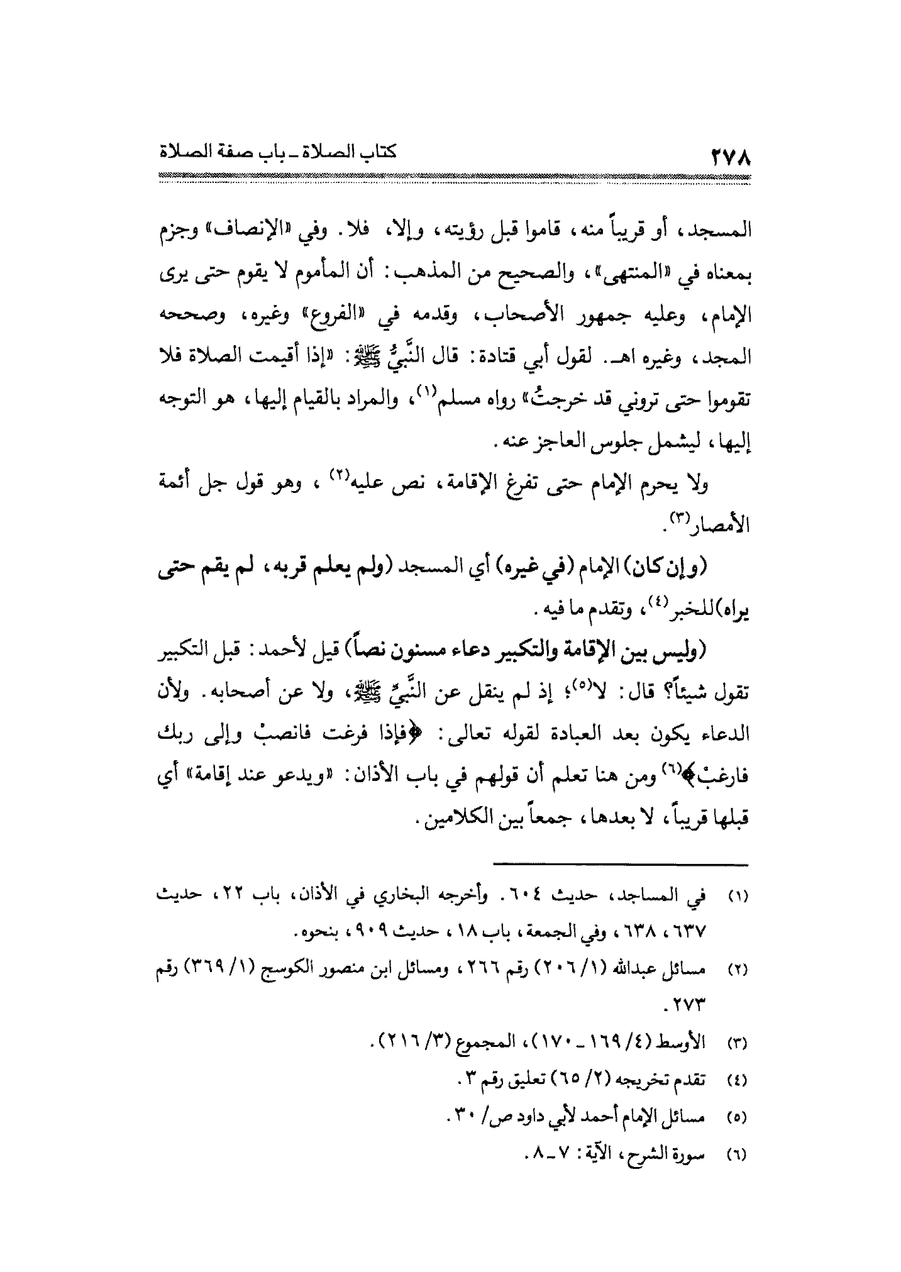 (وليس بين الإقامة والتكبير دعاء مسنون نصًا) قيل لأحمد: قبل التكبير تقول شيئًا؟ قال لا (¬٥)؛ إذ لم ينقل عن النَّبيِّ - صلى الله عليه وسلم -، ولا عن أصحابه. ولأن الدعاء يكون بعد العبادة لقوله تعالى: {فَإِذَا فَرَغْتَ فَانْصَبْ (٧) وَإِلَى رَبِّكَ فَارْغَبْ} (¬٦) وعن هنا تعلم أن قولهم في باب الأذان: "ويدعو عند إقامة" أي قبلها قريبًا، لا بعدها، جمعًا بن الكلامين.