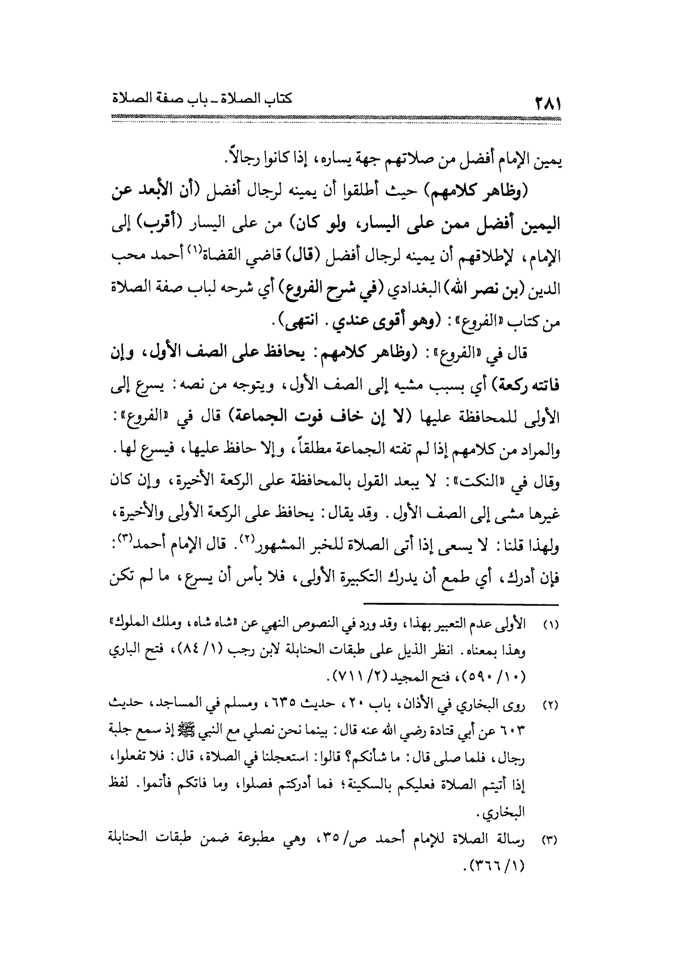 (وظاهر كلامهم) حيث أطلقوا أن يمينه لرجال أفضل (أن الأبعد عن اليمين أفضل ممن على اليسار، ولو كان) من على اليسار (أقرب) إلى الإِمام؛ لإطلاقهم أن يمينه لرجال أفضل (قال) قاضي القضاة (¬١) أحمد محب الدين (بن نصر الله) البغدادي (في شرح الفروع) أي شرحه لباب صفة الصلاة من كتاب "الفروع": (وهو أقوى عندي. انتهى).