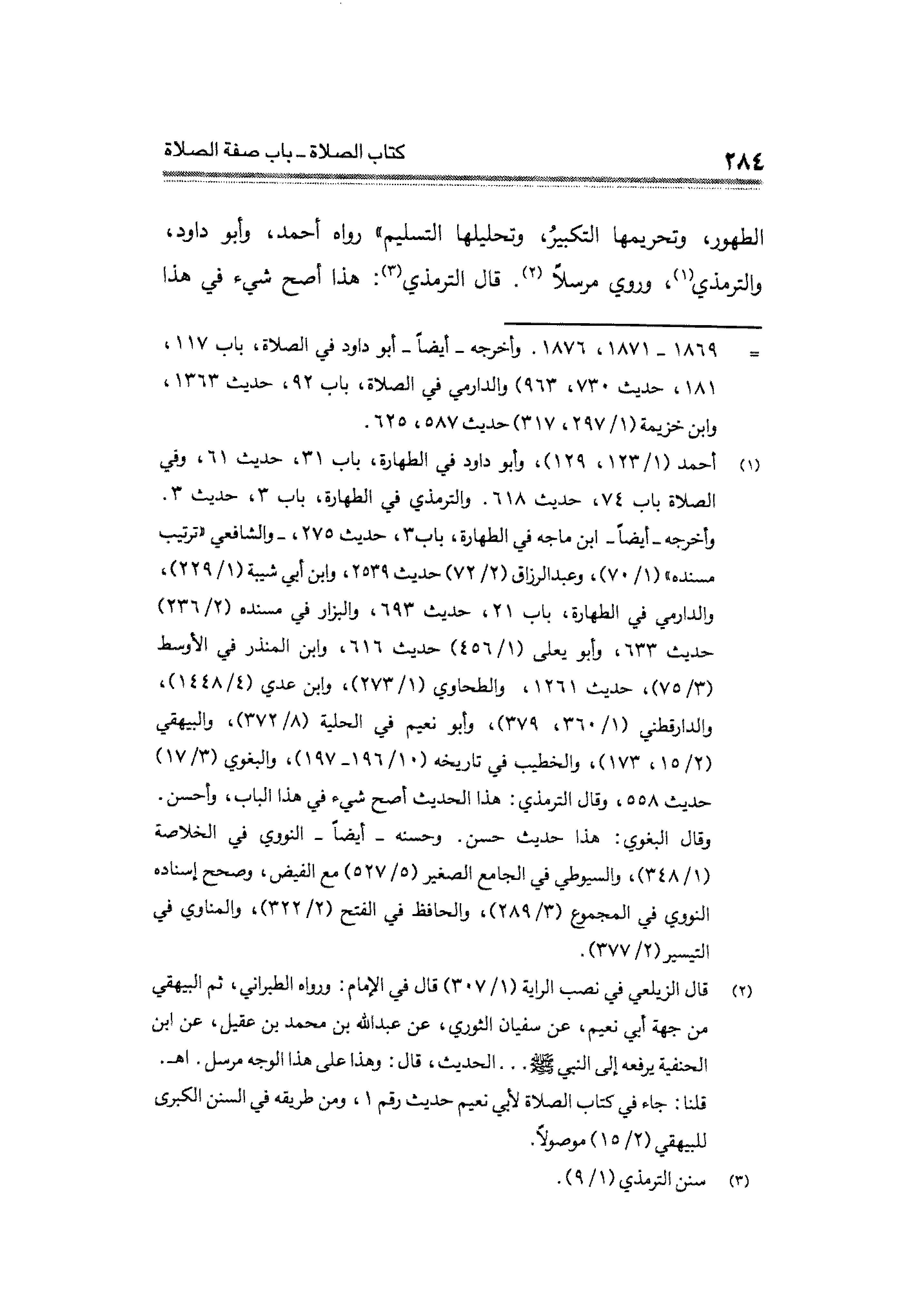الطهور، وتحريمها التكبيرُ، وتحليلها التسليم، رواه أحمد، وأبو داود، والترمذي (¬١)، وروي مرسلًا (¬٢). قال الترمذي (¬٣): هذا أصح شيء في هذا