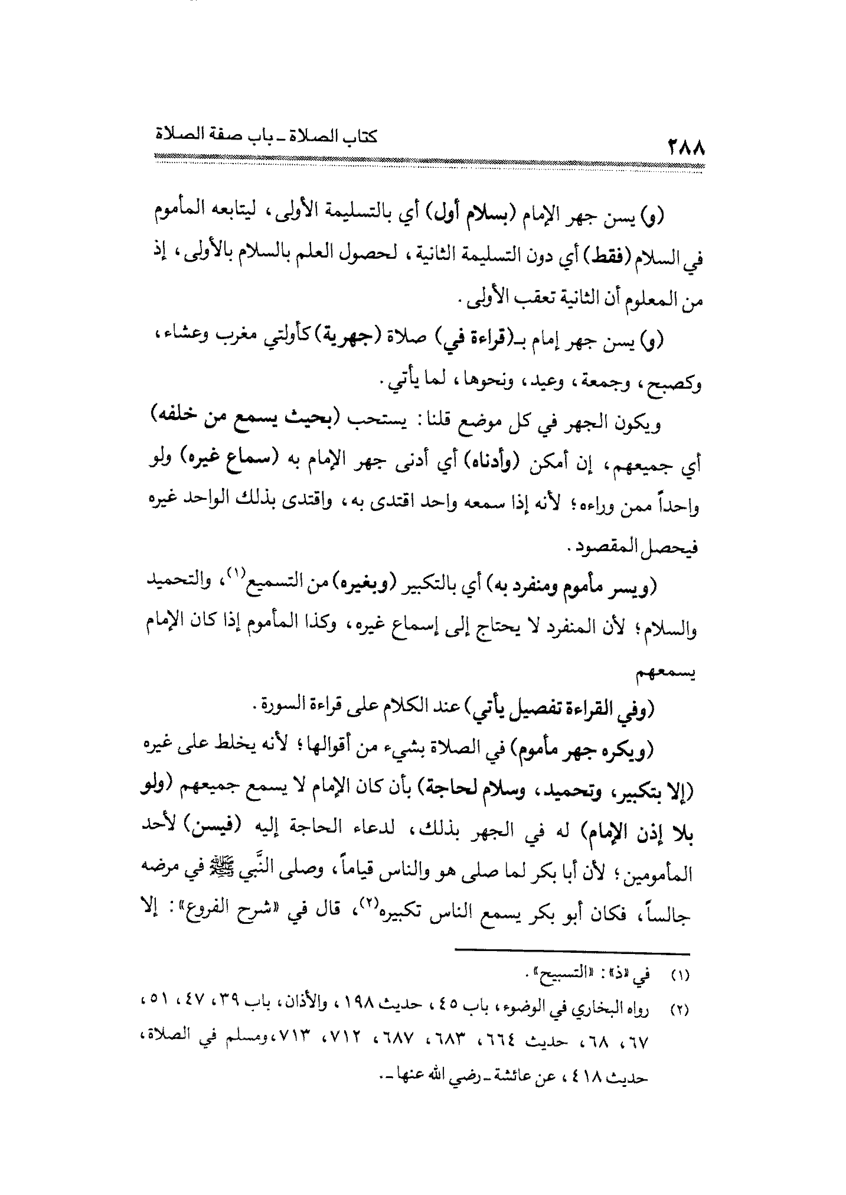 (ويكره جهر مأموم) في الصلاة بشيء من أقوالها؛ لأنه يخلط على غيره (إلا بتكبير، وتحميد، وسلام لحاجة) بأن كان الإِمام لا يسمع جمعهم (ولو بلا إذن الإمام) له في الجهة بذلك، لدعاء الحاجة إليه (فيسن) لأحد المأمومين؛ لأن أبا بكر لما صلى هو والناس قيامًا، وصلى النَّبي - صلى الله عليه وسلم - في مرضه جالسًا، فكان أبو بكر يسمع الناس تكبيره (¬٢)، قال في "شرح الفروع": إلا
