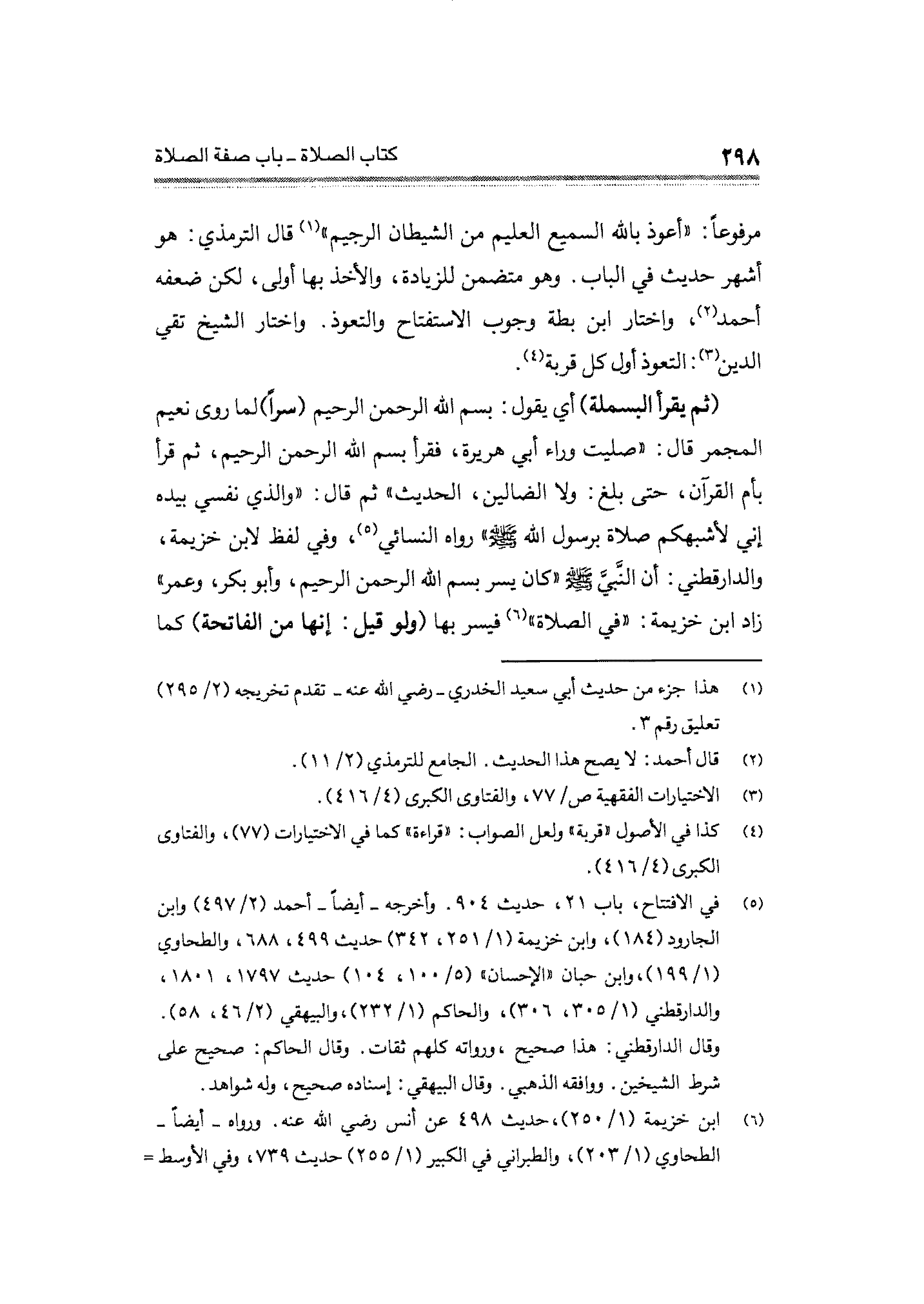 مرفوعًا: "أعوذ بالله السميع العليم من الشيطان الرجيم" (¬١) قال الترمذي: هو أشهر حديث في الباب. وهو متضمن للزيادة، والأخذ بها أولى، لكن ضعفه أحمد (¬٢)، واختار ابن بطة وجوب الاستفتاح والتعوذ. واختار الشيخ تقي الدين (¬٣): التعوذ أول كل قربة (¬٤).