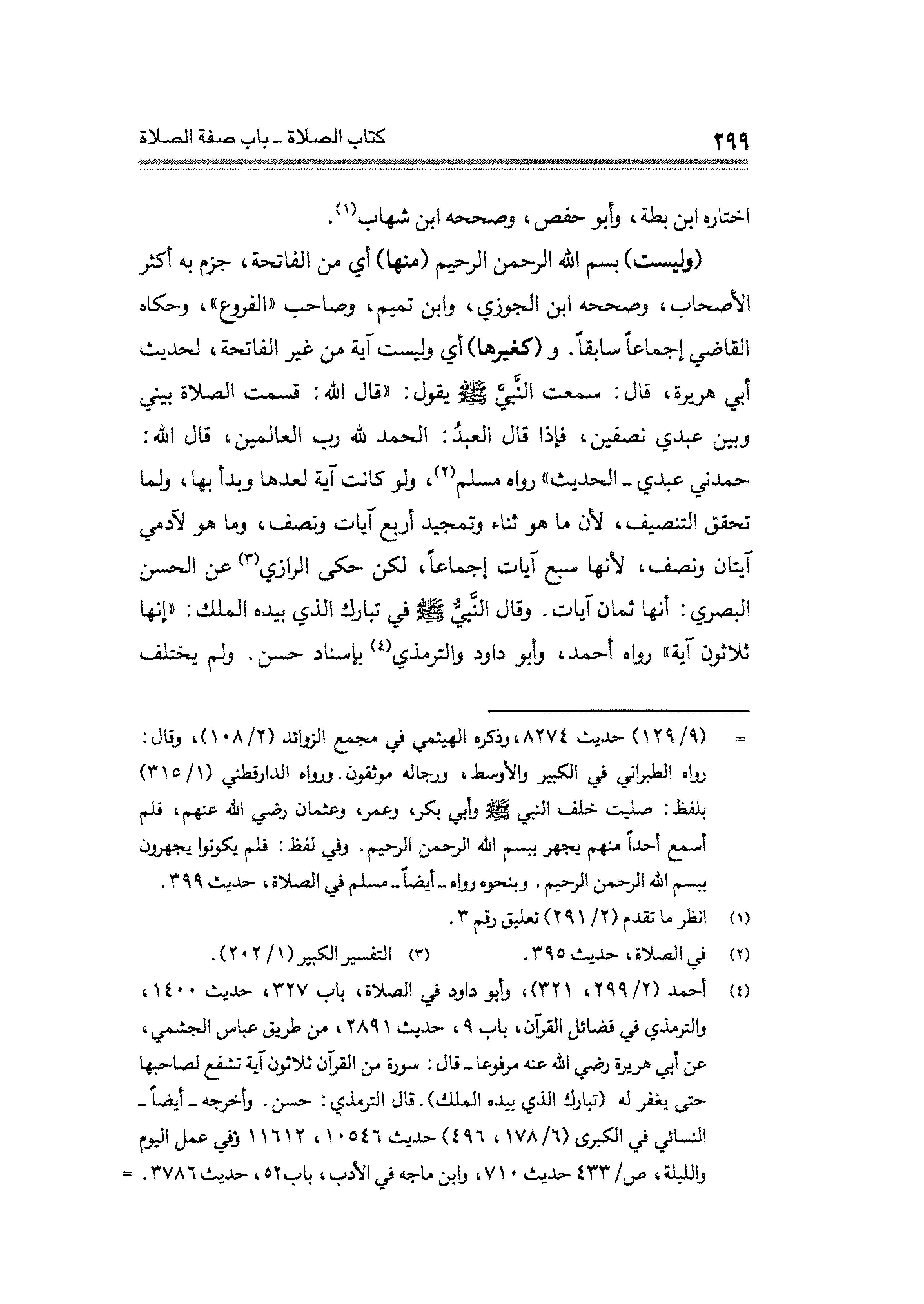 (وليست) بسم الله الرحمن الرحيم (منها) أي من الفاتحة، جزم به أكثر الأصحاب، وصححه ابن الجوزي، وابن تميم، وصاحب "الفروع"، وحكاه القاضي إجماعًا سابقًا. و (كغيرها) أي وليست آية من غير الفاتحة، لحديث أبي هريرة، قال: سمعت النَّبيَّ يقول: "قال الله: قسمت الصلاة بيني وبين عبدي نصفين، فإذا قال العبدُ: الحمد لله رب العالمين، قال الله: حمدني عبدي -الحديث، رواه مسلم (¬٢)، ولو كانت آية لعدها وبدأ بها، ولما تحقق التنصيف، لأن ما هو ثناء وتمجيد أربع آيات ونصف، وما هو لآدمي آيتان ونصف، لأنها سبع آيات إجماعًا، لكن حكى الرازي (¬٣)، عن الحسن البصري: أنها ثمان آيات. وقال النَّبيّ - صلى الله عليه وسلم - في تبارك الَّذي بيده الملك: "إنها ثلاثون آية" رواه أحمد، وأبو داود والترمذي (¬٤)، بإسناد حسن. ولم يختلف