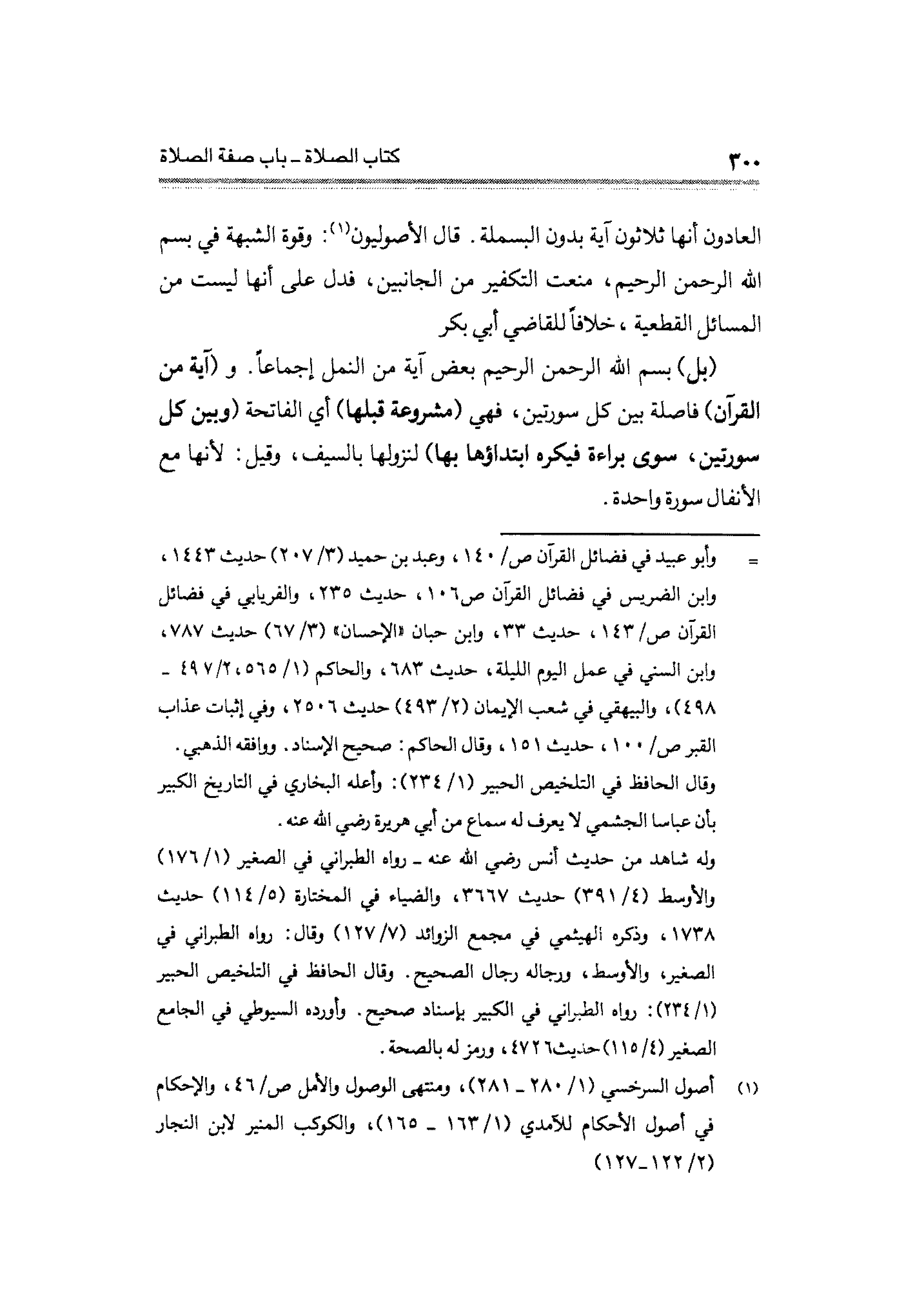 العادون أنها ثلاثون آية بدون البسملة قال الأصوليون (¬١): وقوة الشبهة في بسم الله الرحمن الرحيم، منعت التكفير من الجانبين، فدل على أنها ليست من المسائل القطعية، خلافًا للقاضي أبي بكر (بل) بسم الله الرحمن الرحيم بعض آية عن النمل إجماعًا. و (آية من القرآن) فاعلة بين كل سورتين، فهي (مشروعة قبلها) أي الفاتحة (وبين كل سورتين، سوى براءة فيكره ابتدأوها بها) لنزولها بالسيف، وقيل: لأنها مع. الأنفال سورة واحدة.