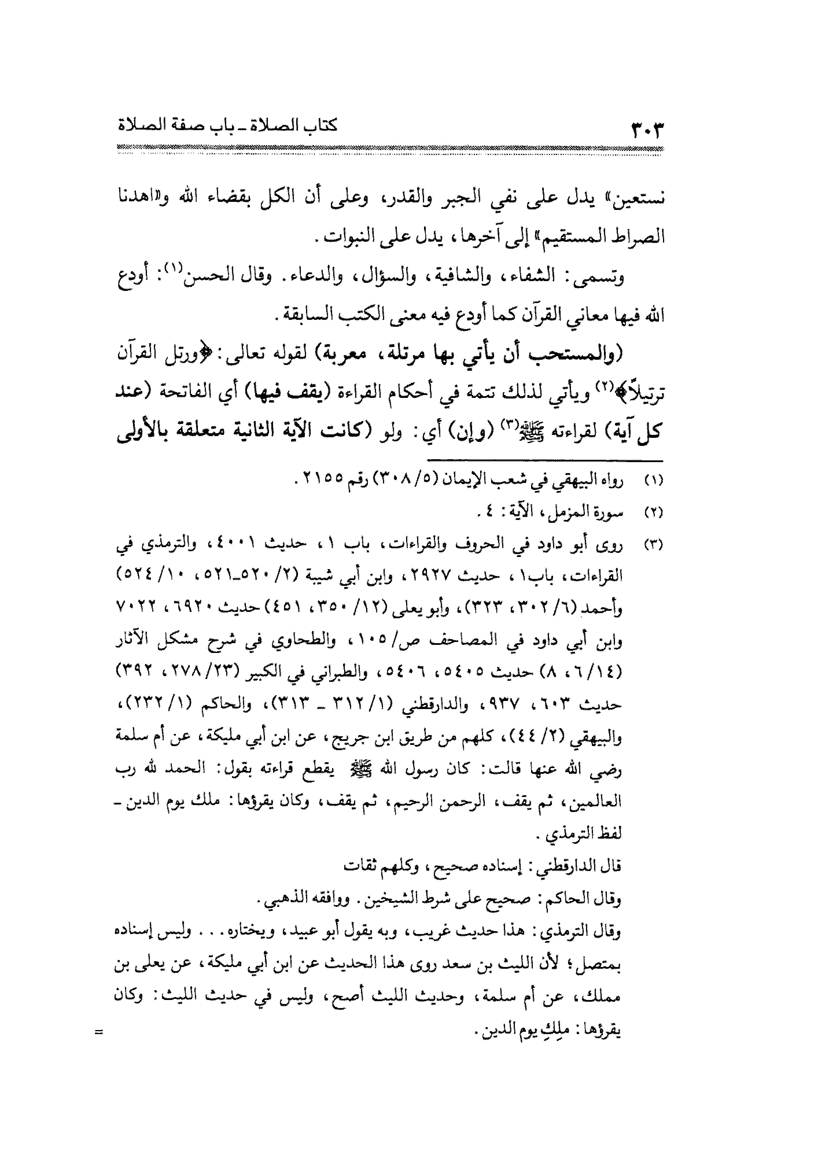 (¬٣) روى أبو داود في الحروف والقراءات، باب ١، حديث ٤٠٠١، والترمذي في القراءات، باب ١، حديث ٢٩٢٧، وابن أبي شيبة (٢/ ٥٢٠ - ٥٢١، ١٠/ ٥٢٤) وأحمد (٦/ ٣٠٢، ٣٢٣)، وأبو يعلى (١٢/ ٣٥٠، ٤٥١، حديث ٦٩٢٠، ٧٠٢٢ وابن أبي داود في المصاحف ص/١٠٥، والطحاوي في شرح مشكل الآثار (١٤/ ٦، ٨) حديث ٥٤٠٥، ٥٤٠٦، والطبراني في الكبير (٢٣/ ٢٧٨، ٣٩٢) حديث ٦٠٣، ٩٣٧، والدارقطني (١/ ٣١٢ - ٣١٣)، والحاكم (١/ ٢٣٢)، والبيهقي (٢/ ٤٤)، كلهم من طريق ابن جريج، عن ابن أبي مليكة، عن أم سلمة رضي الله منها قالت: كان رسول الله - صلى الله عليه وسلم - يقطع قراءته بقول: الحمد لله رب العالمين، ثم يقف، الرحمن الرحيم، ثم يقف، وكان يقرؤها: ملك يوم الدين -لفظ الترمذي.