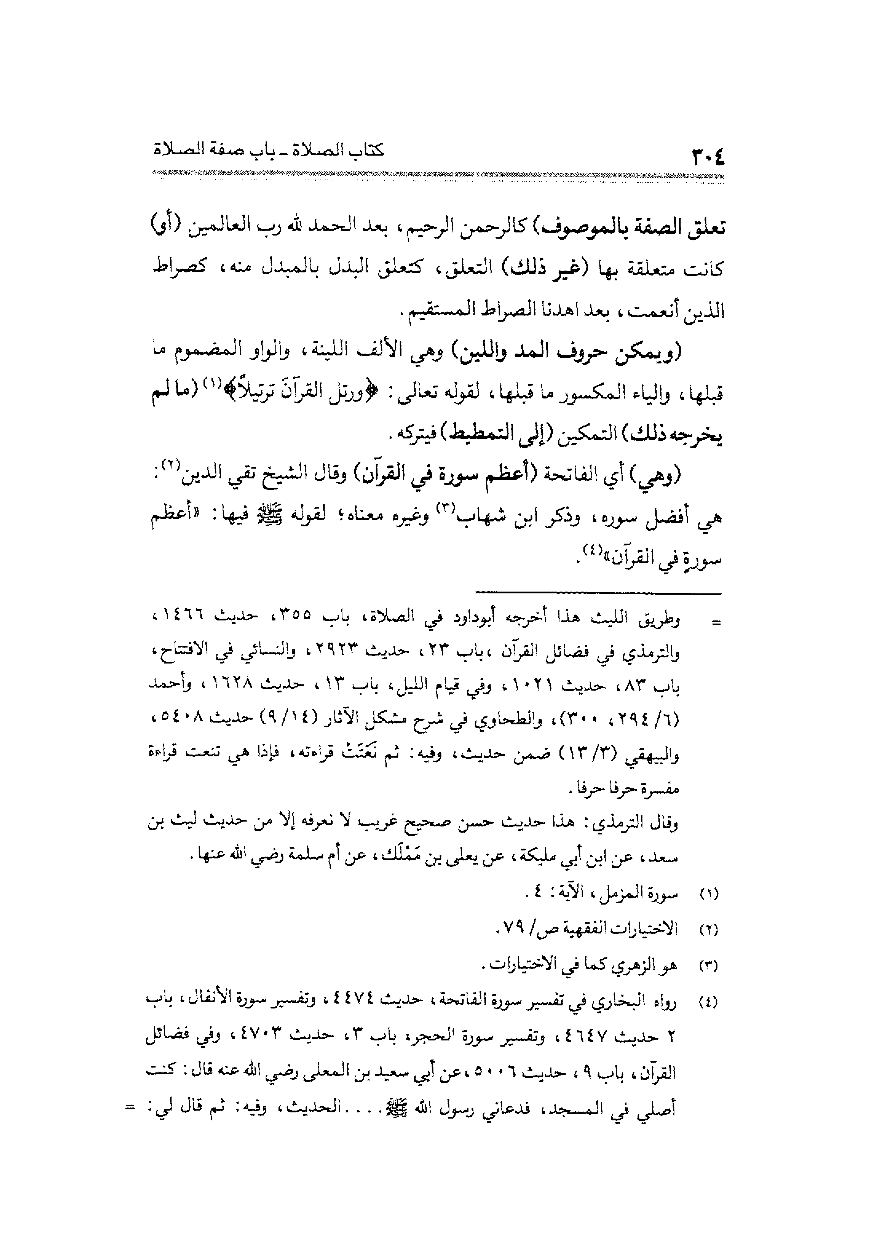 تعلق الصفة بالموصوف) كالرحمن الرحيم، بعد الحمد لله رب العالمين (أو) كانت متعلقة بها (غير ذلك) التعلق، كتعلق البدل بالمبدل منه، كصراط الذين أنعمت، بعد اهدنا الصراط المستقيم.