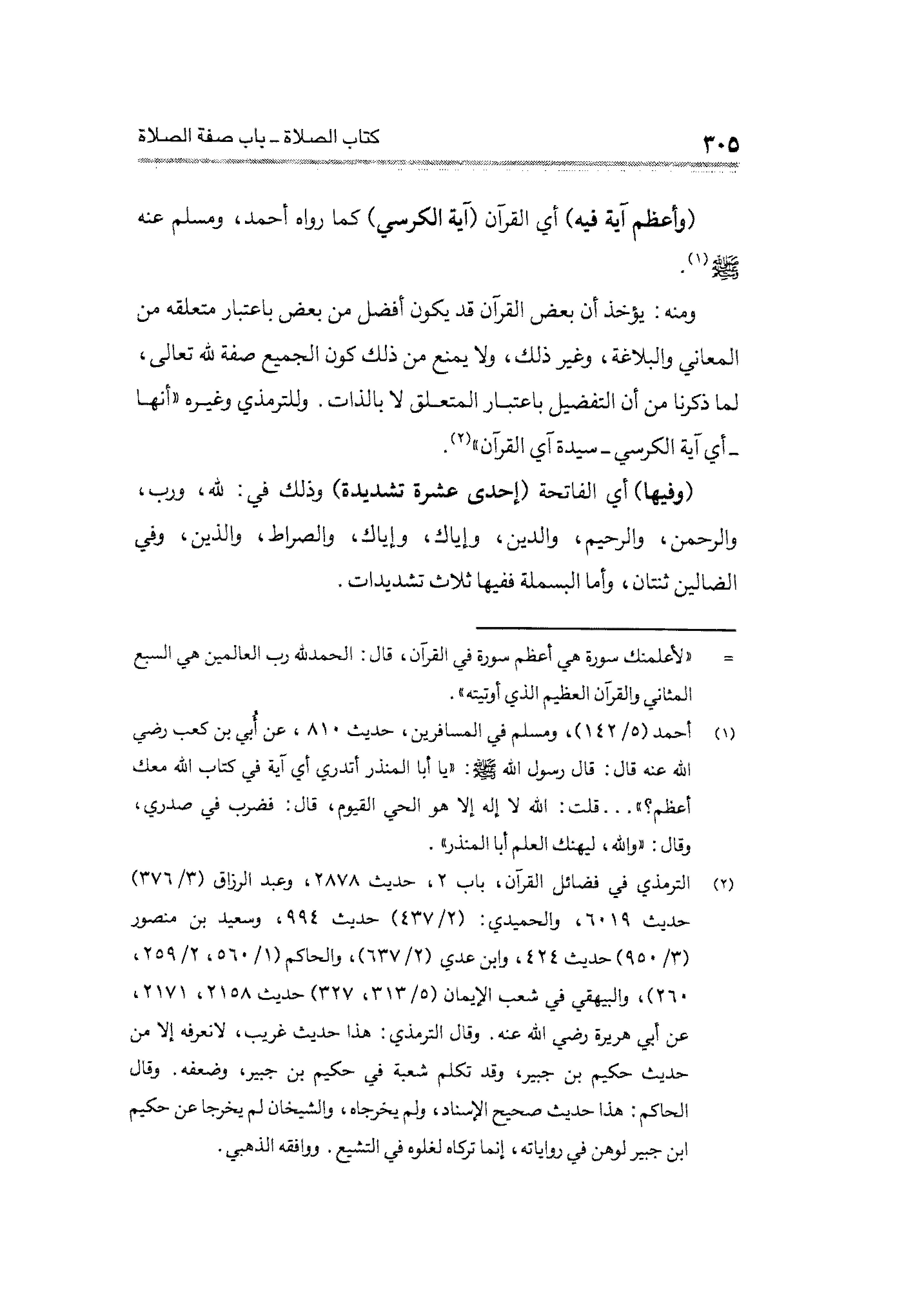 ومنه: يؤخذ أن بعض القرآن قد يكون أفضل من بعض باعتبار متعلقه من المعاني والبلاغة، وغير ذلك، ولا يمنع من ذلك كون الجميع صفة لله تعالى، لما ذكرنا من أن التفضيل باعتبار المتعلق لا بالذات. وللترمذي وغيره "أنها -أي آية الكرسي- سيدة آي القرآن" (¬٢).